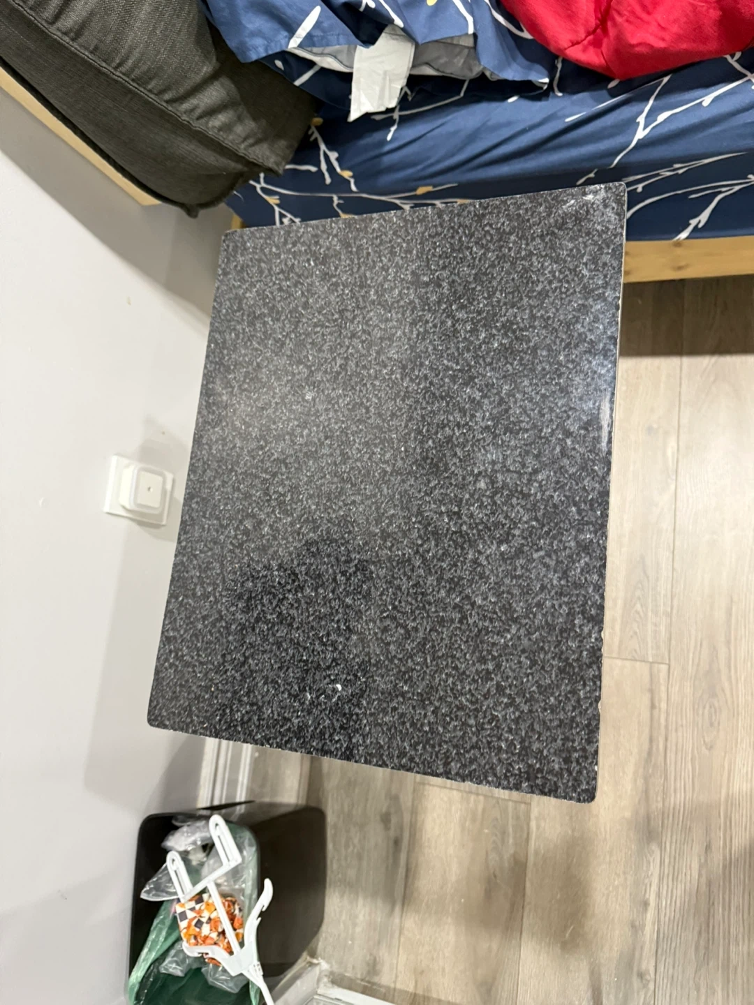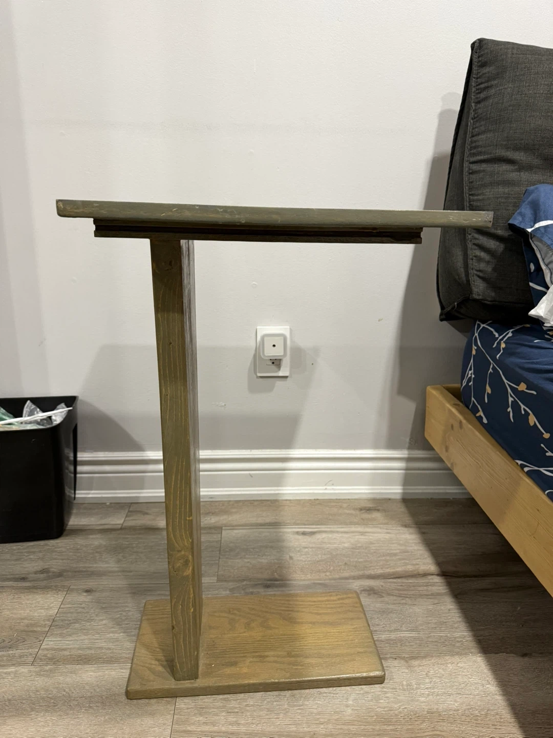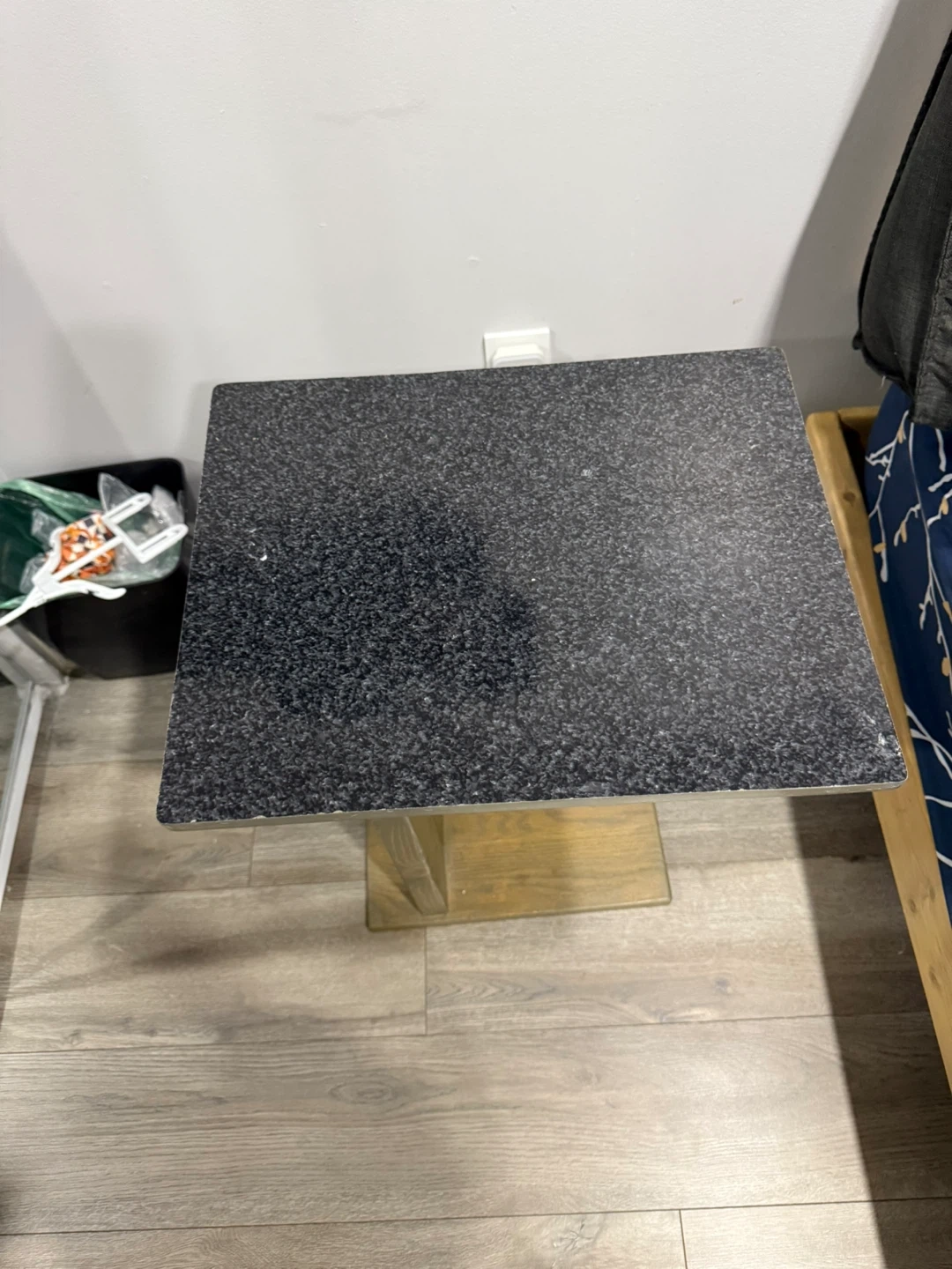 This C-shaped accent table features a speckled black and grey top. Its wooden base and support add a rustic touch. It's great for placing drinks or snacks next to a couch or bed.