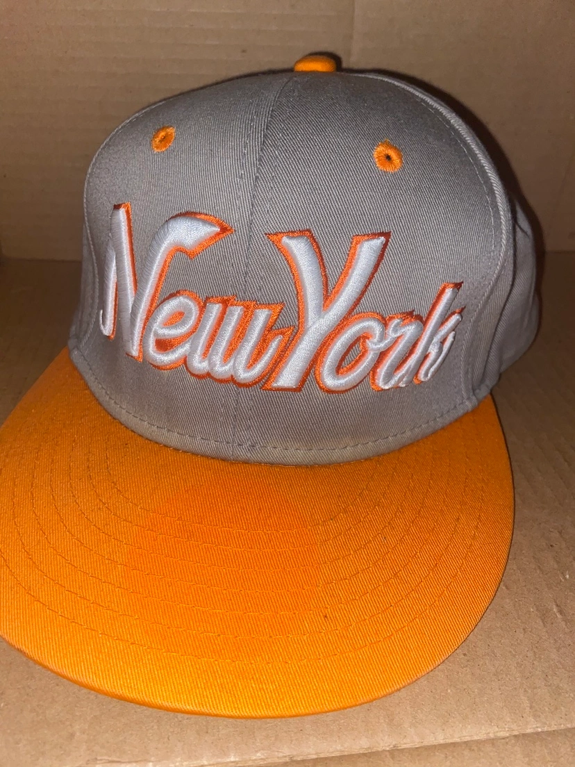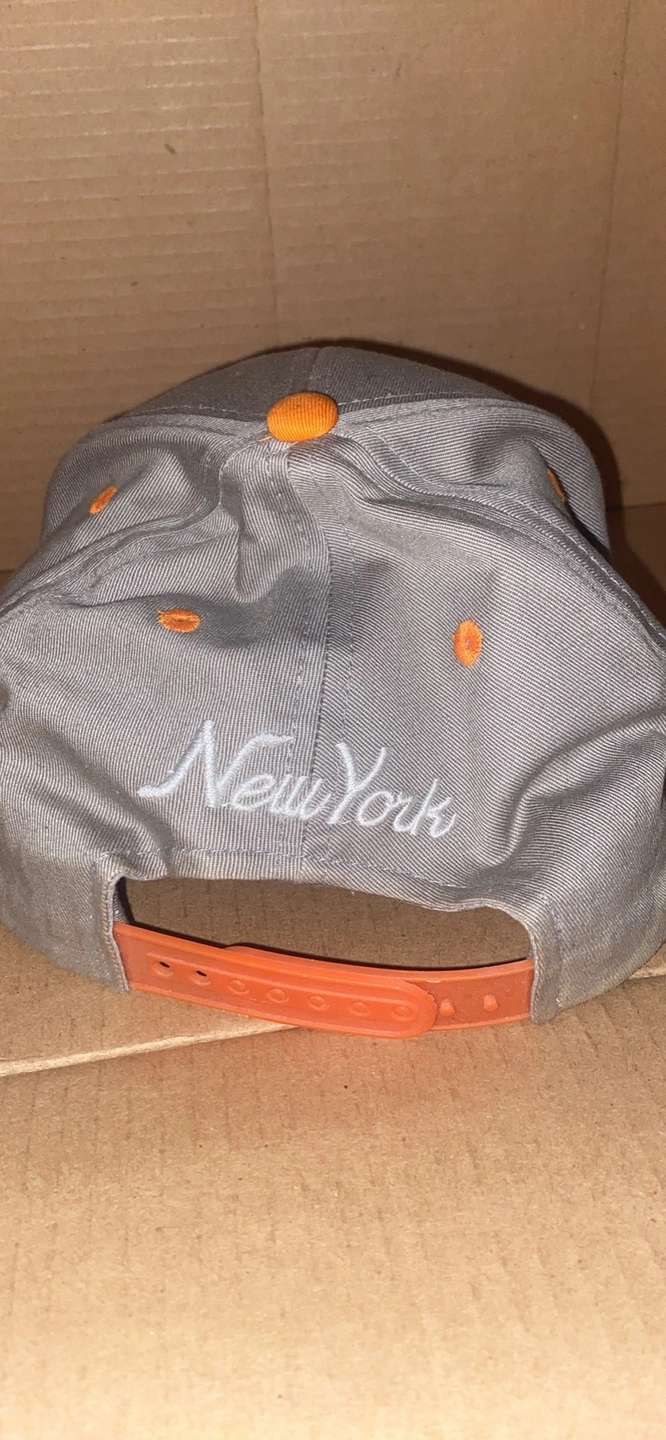 76Grey and Orange Snapback hat with an embroidered New York logo. Cash Only