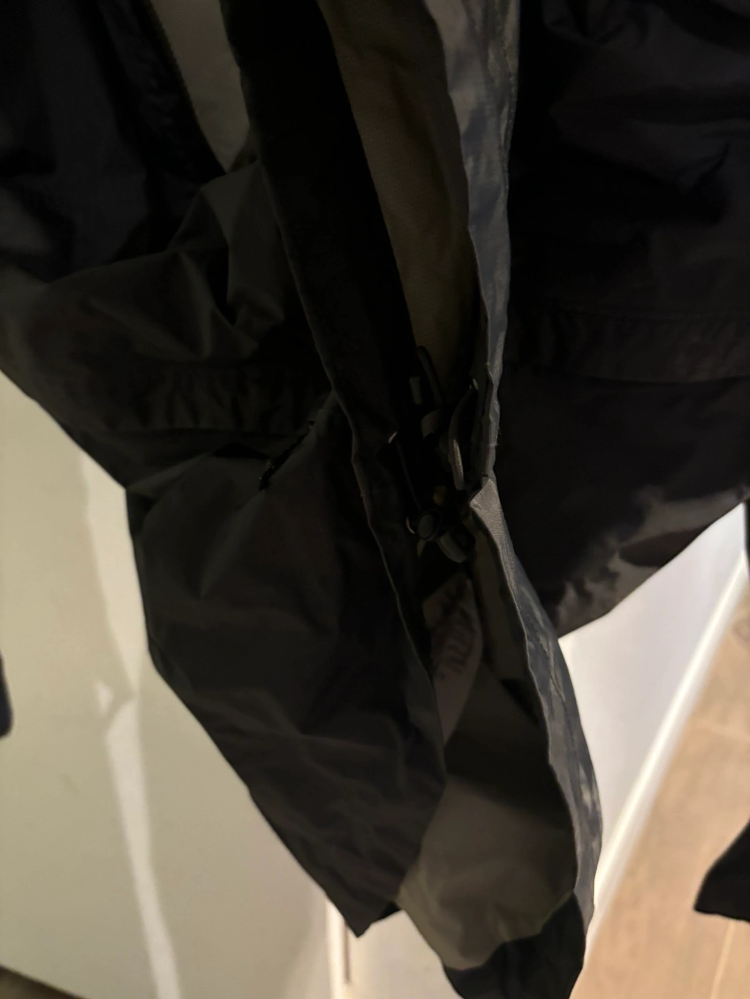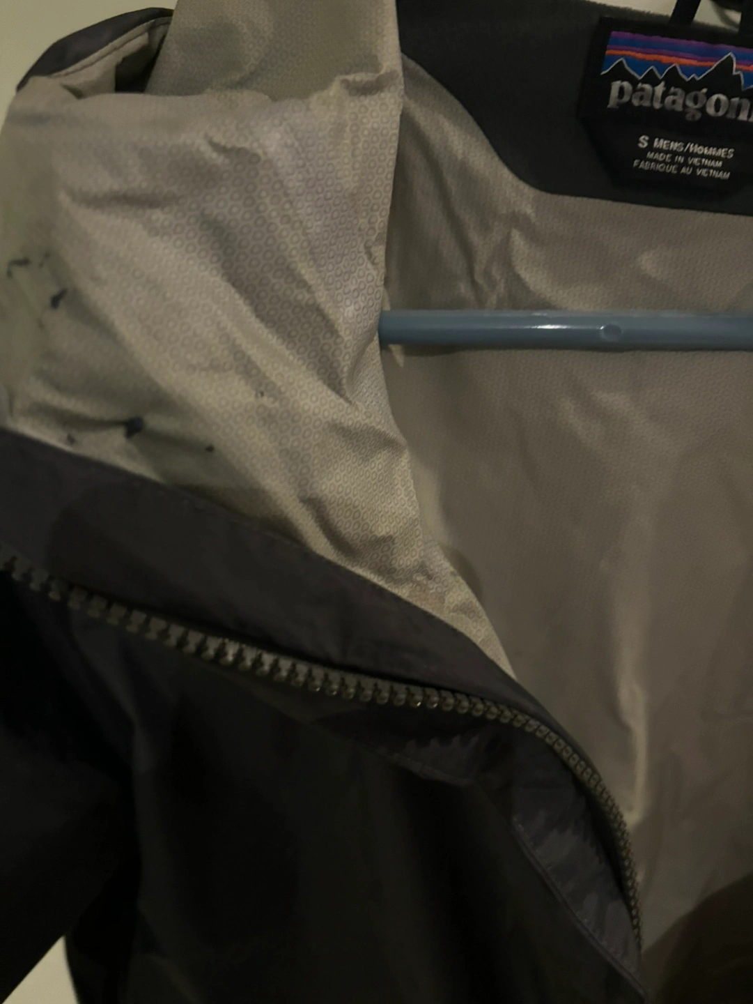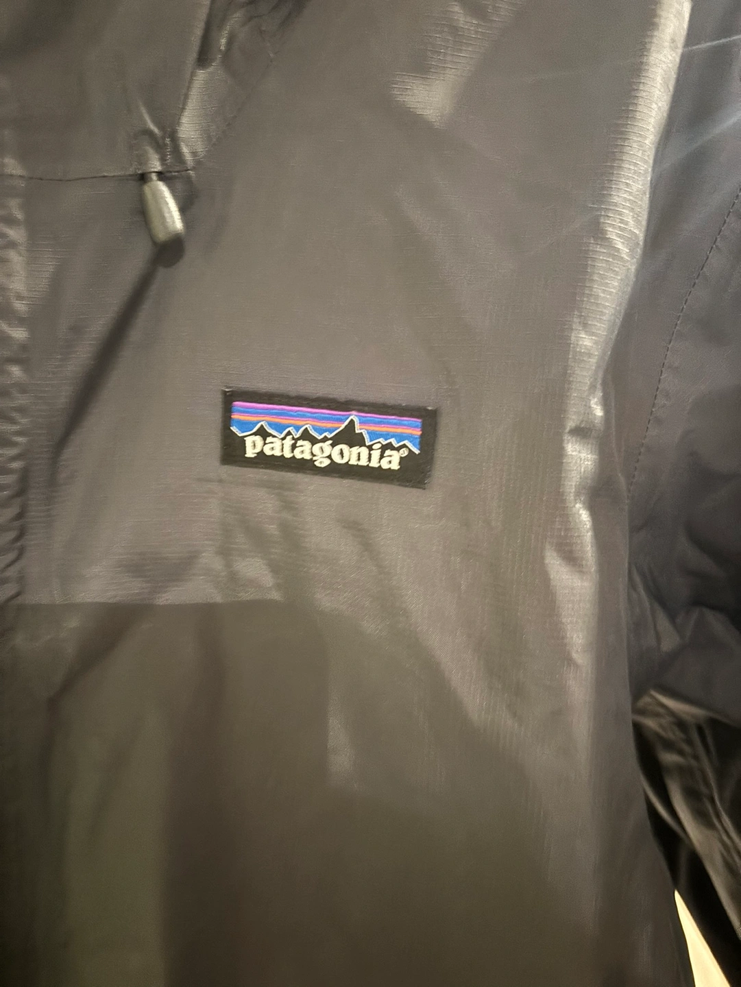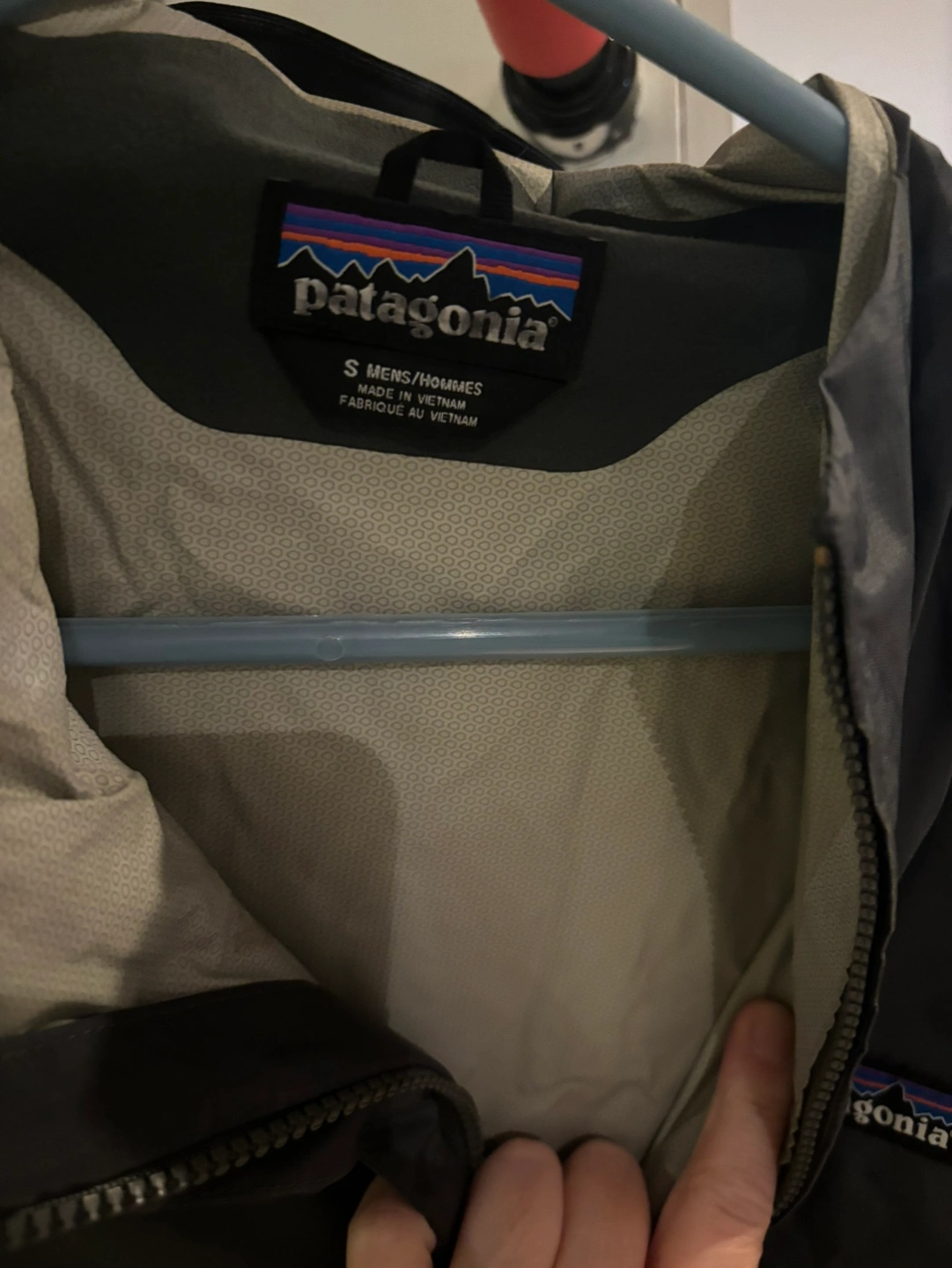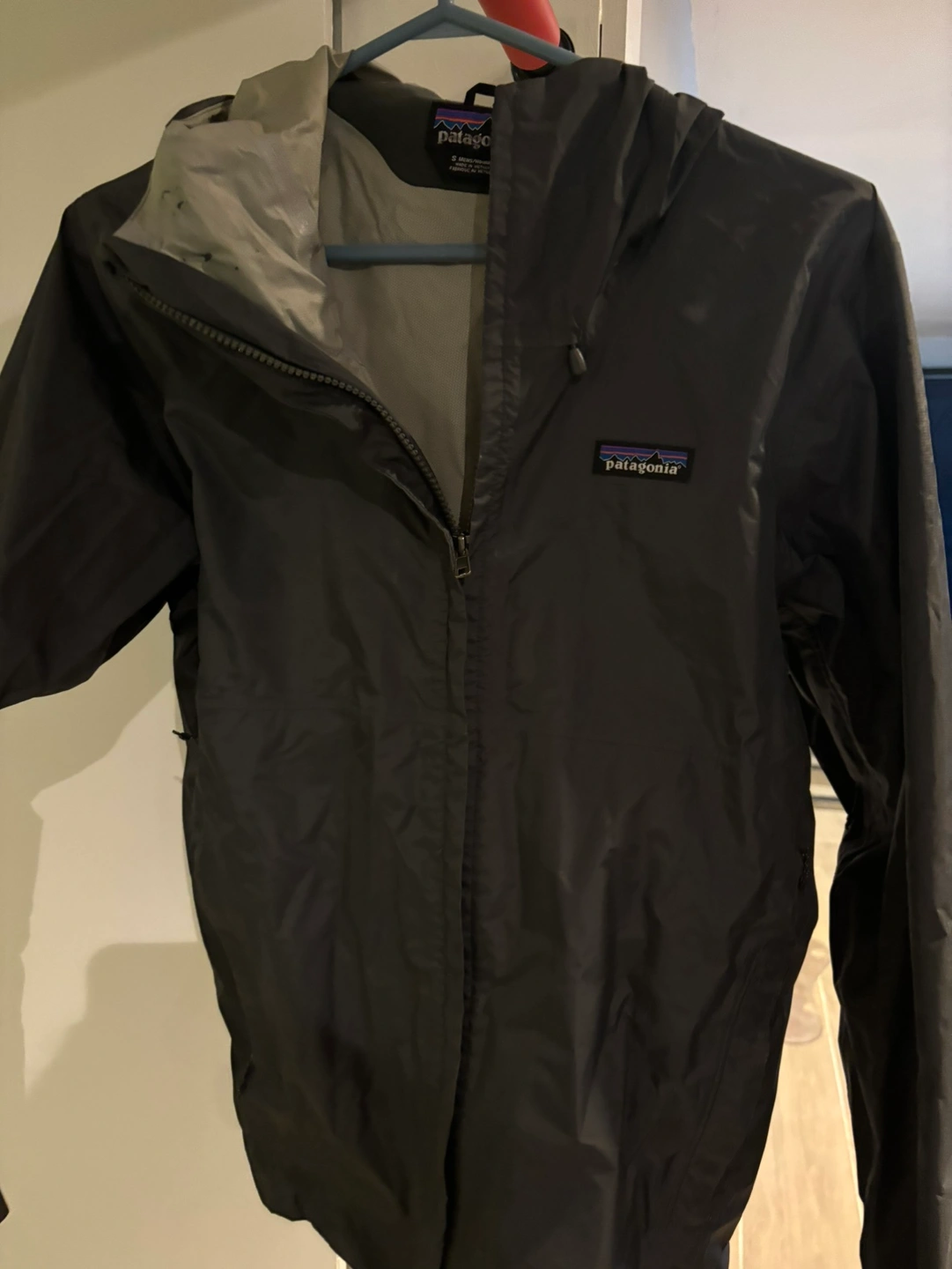 Patagonia rain jacket in black, size small. The jacket is waterproof and windproof. It has a hood and zippered pockets. It is in good condition. It comes from a smoke-free and pet-free home. Feel free to ask any questions you may have. Pick up Etobicoke