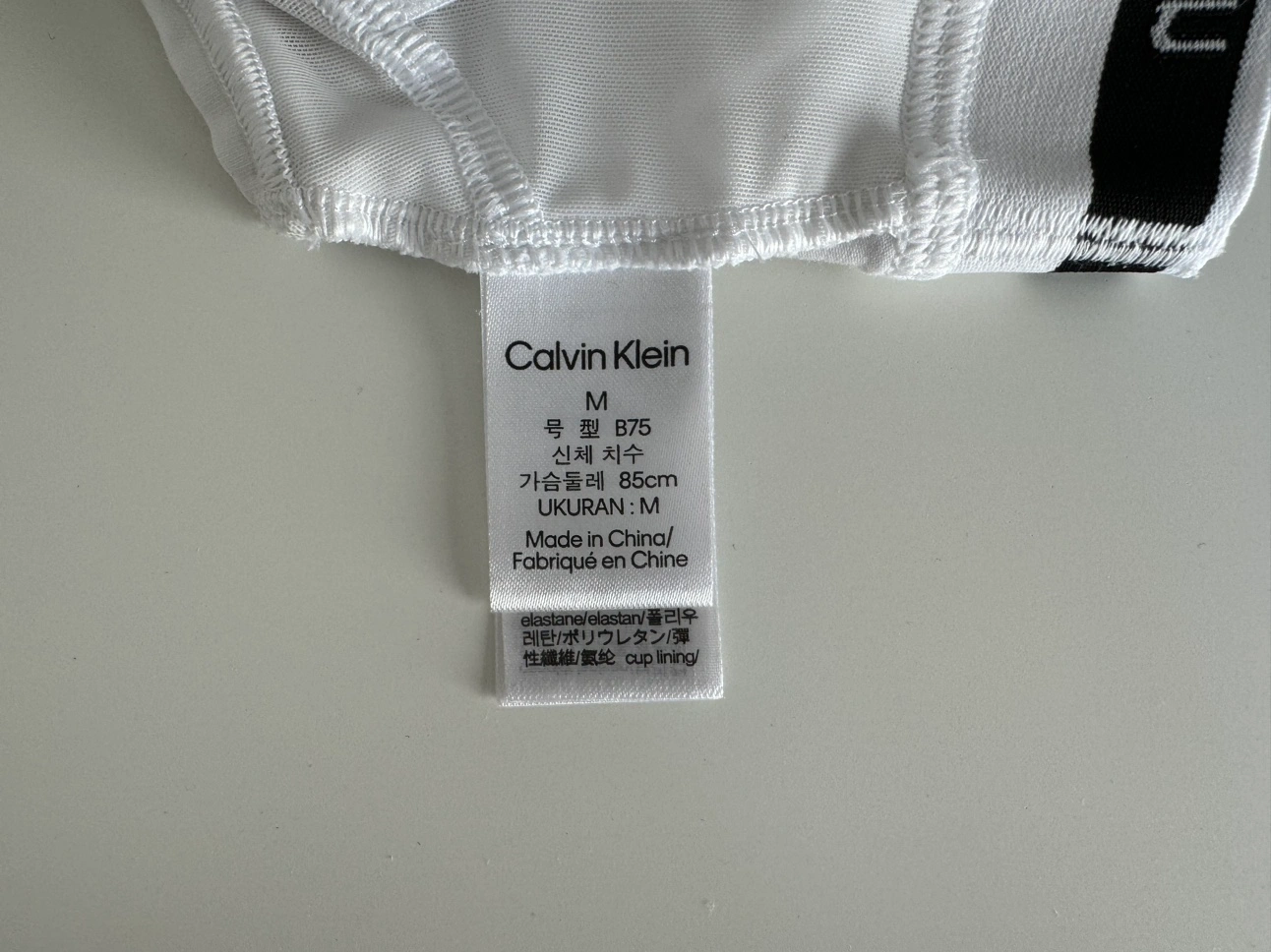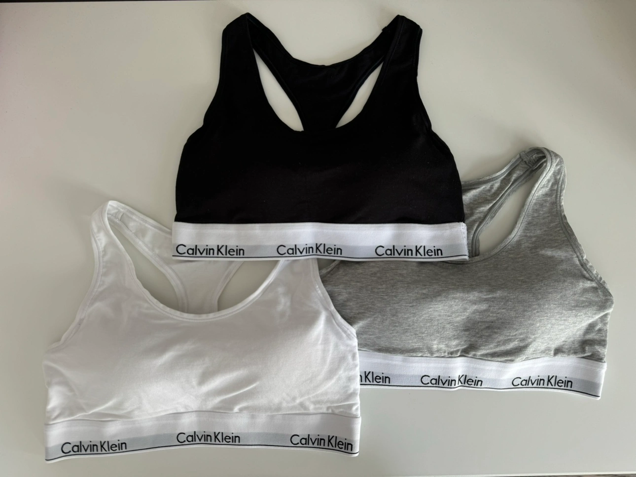 Set of 3 Calvin Klein sports bras in black, white, and grey. All size M (75B/85cm).