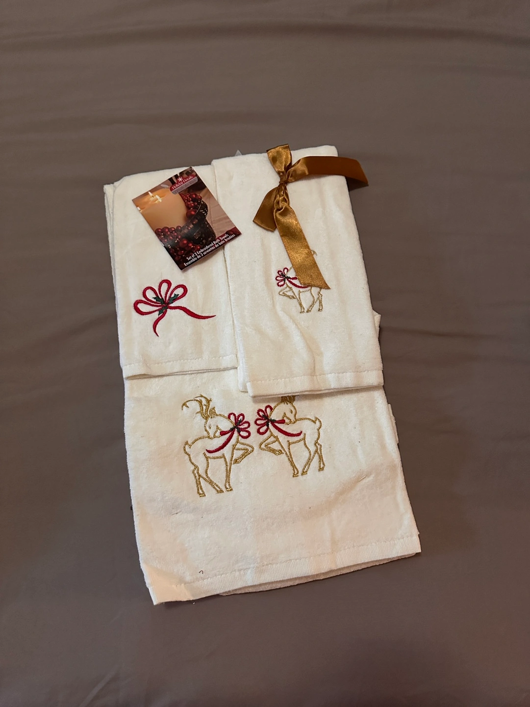 Set of 3 embroidered bath towels with reindeer design. One towel features two reindeer and the other two towels each feature one reindeer. All towels are embroidered with a gold ribbon.