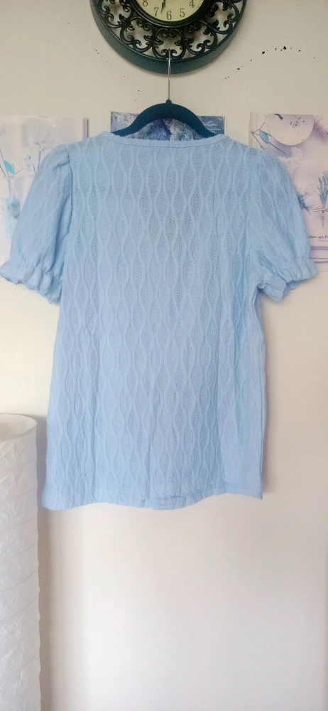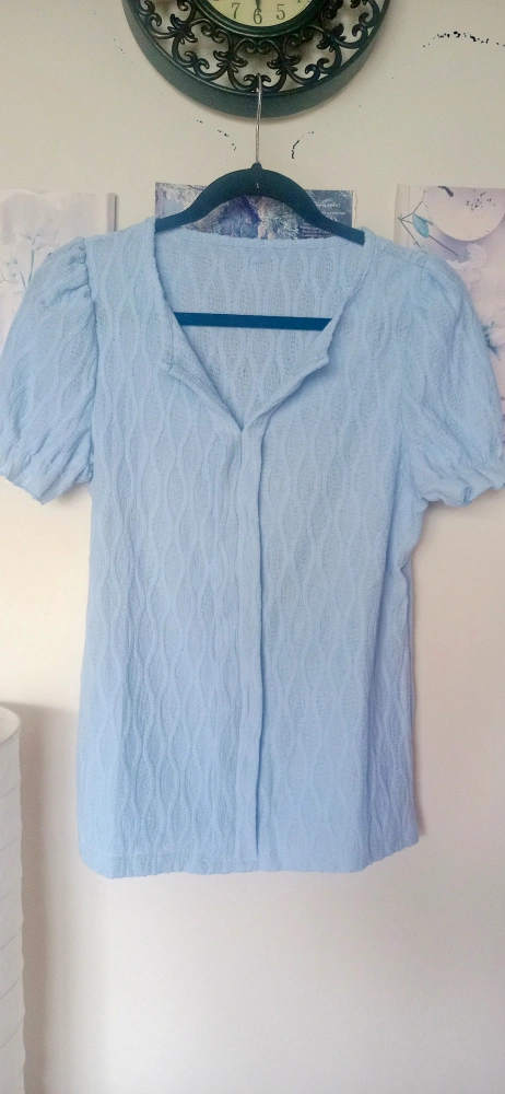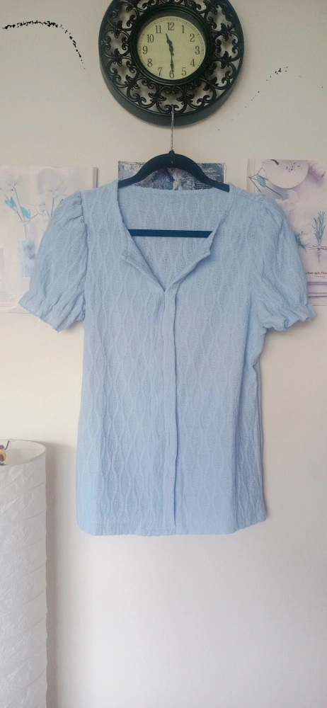 A light blue blouse with puff sleeves. 65% cotton - 35% polyester