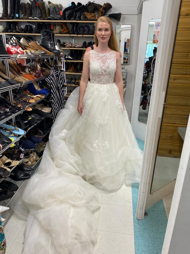 This is a beautiful white wedding dress with a lace bodice and a tulle skirt. It is a size 10. It has a long train. It is in great condition. Can be altered to the right size. Free to someone who will love it!