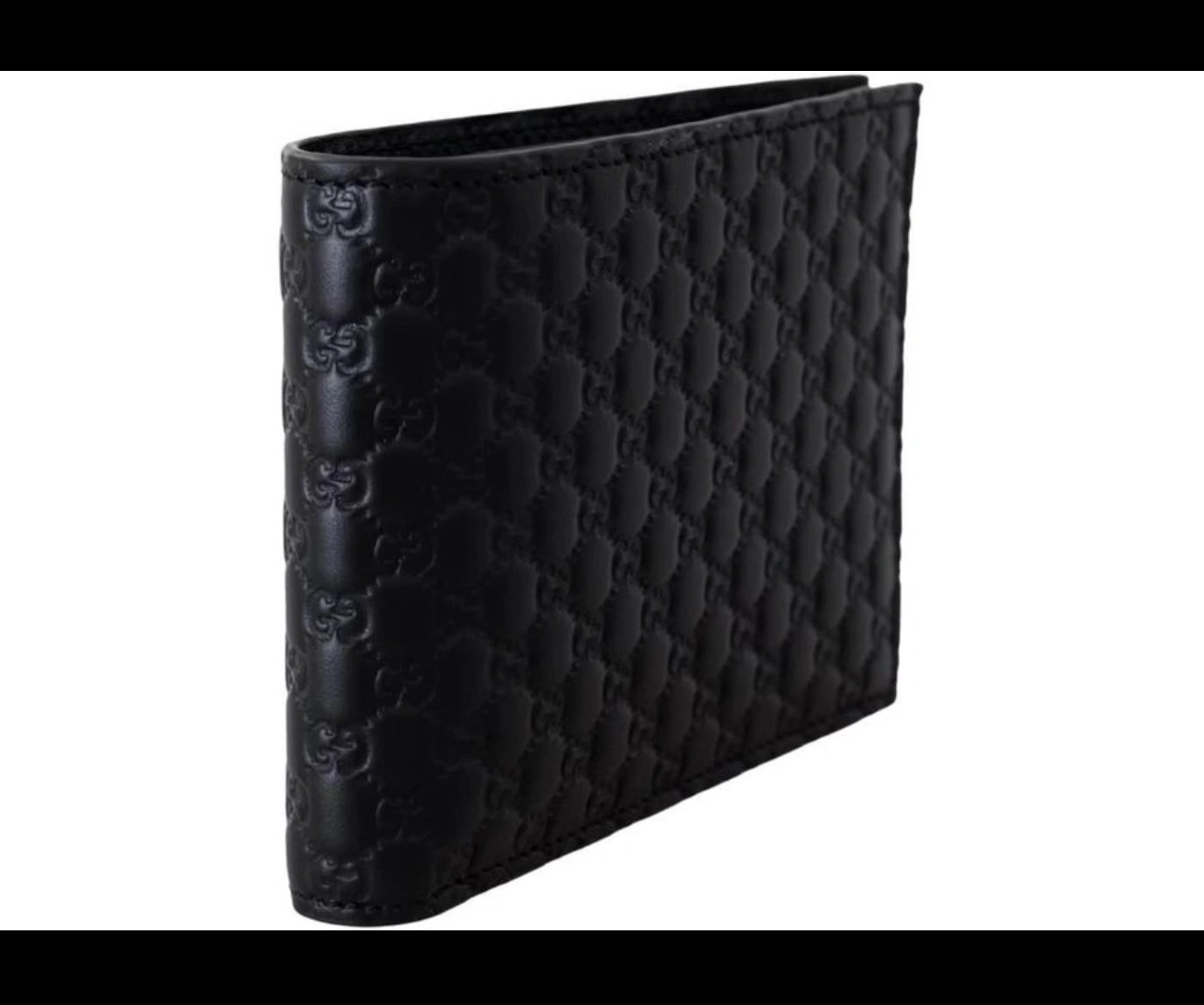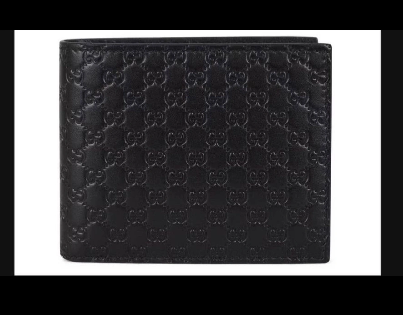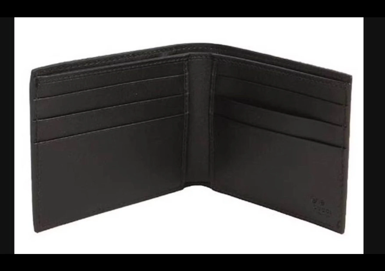 Black leather Gucci GG bifold wallet. Has multiple card slots, billfold compartment, and a pocket.