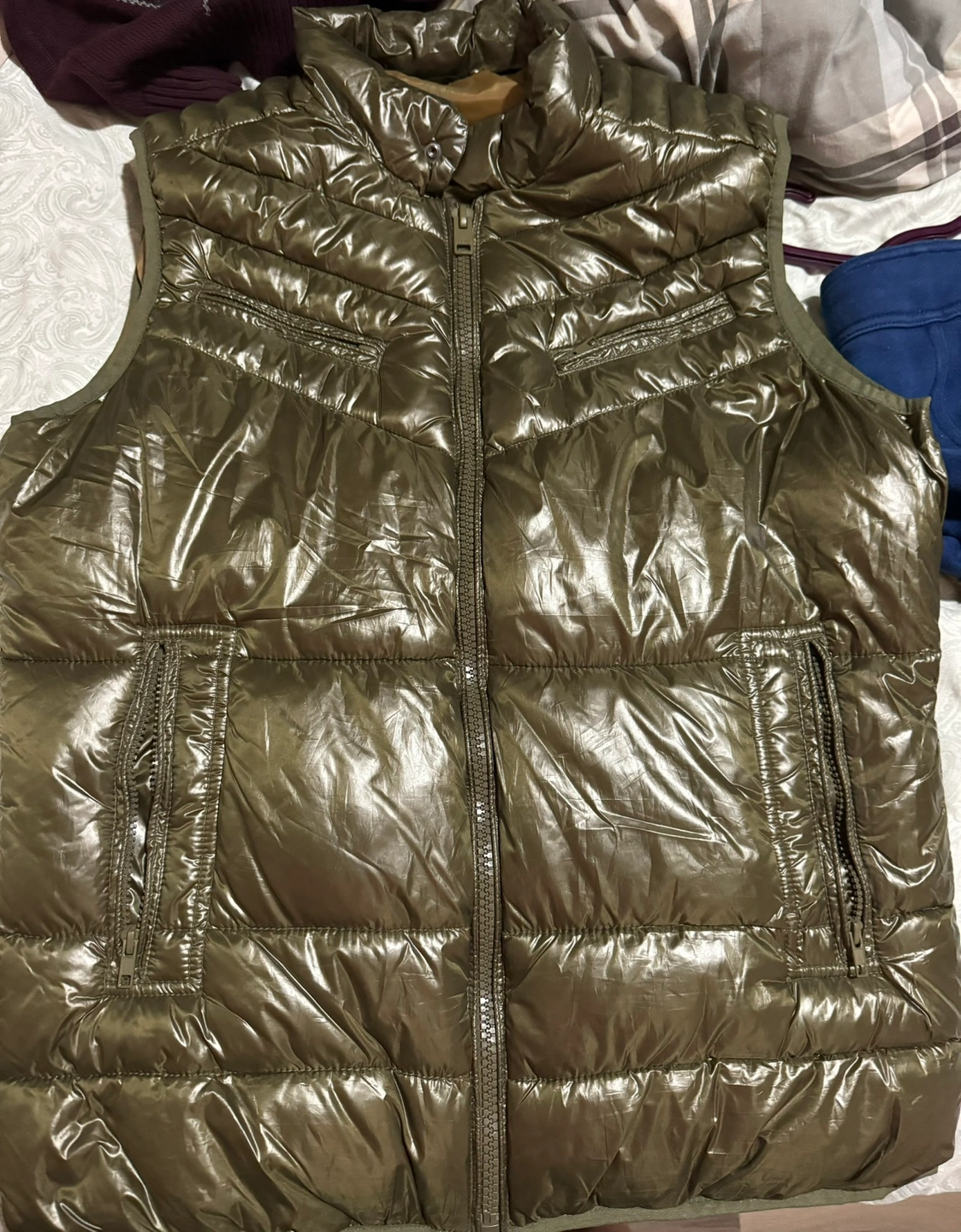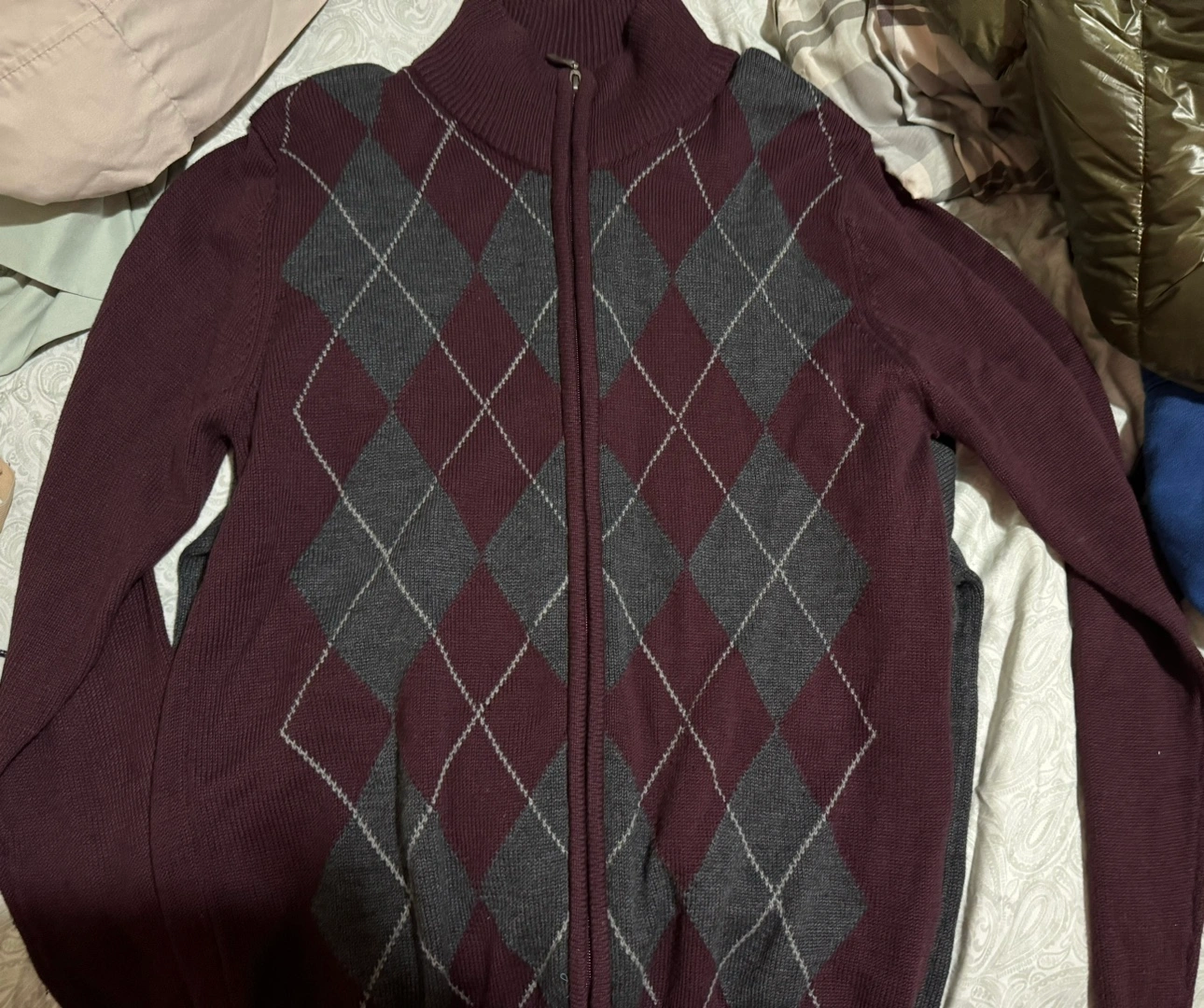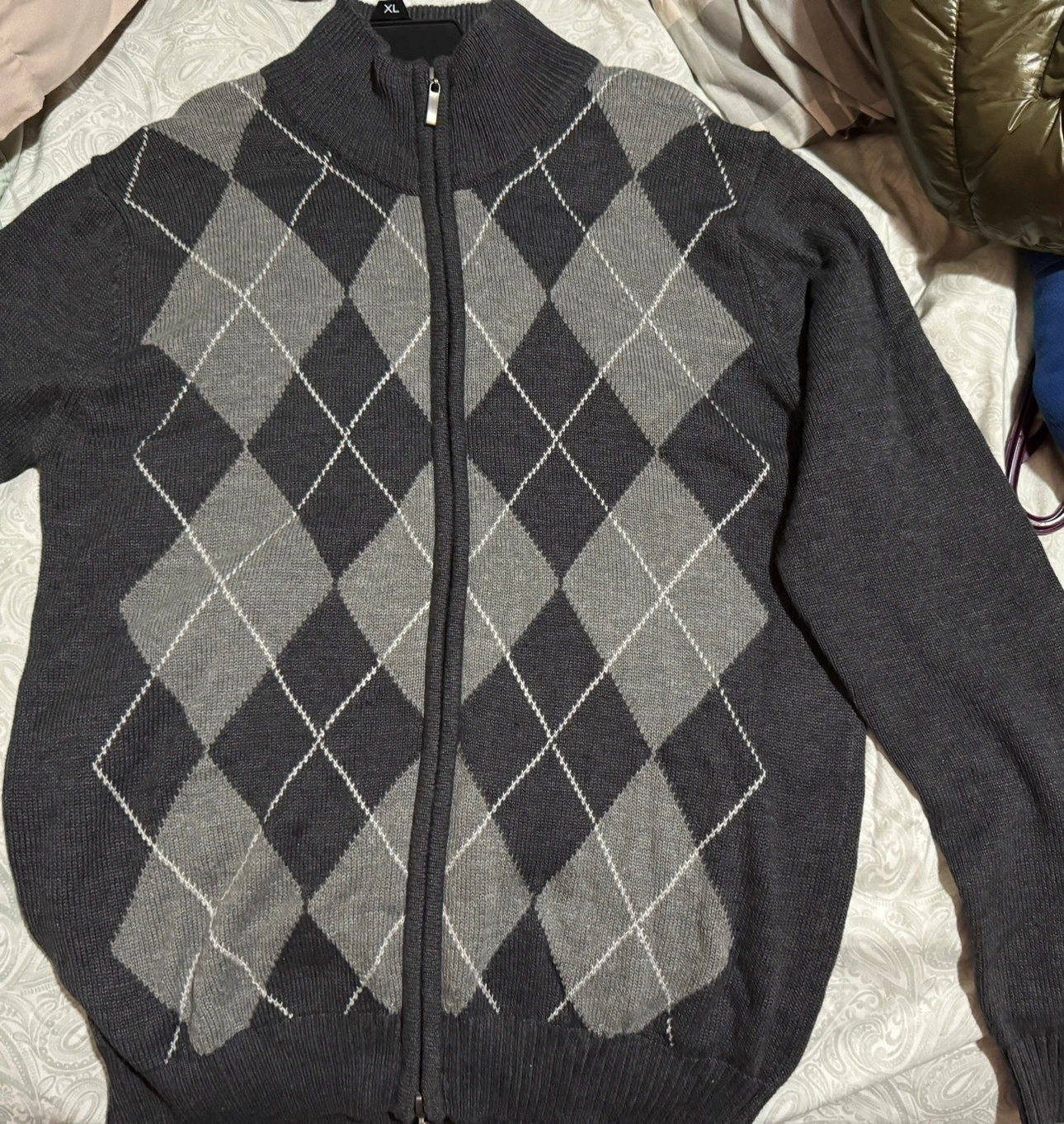 The set includes a grey and white argyle zip up sweater and a green vest. The vest zips up the front and has two pockets. The sweater has a full length zipper.