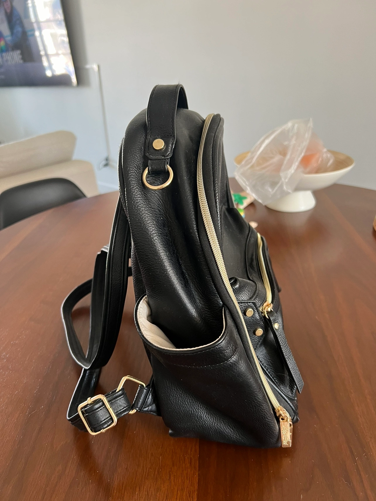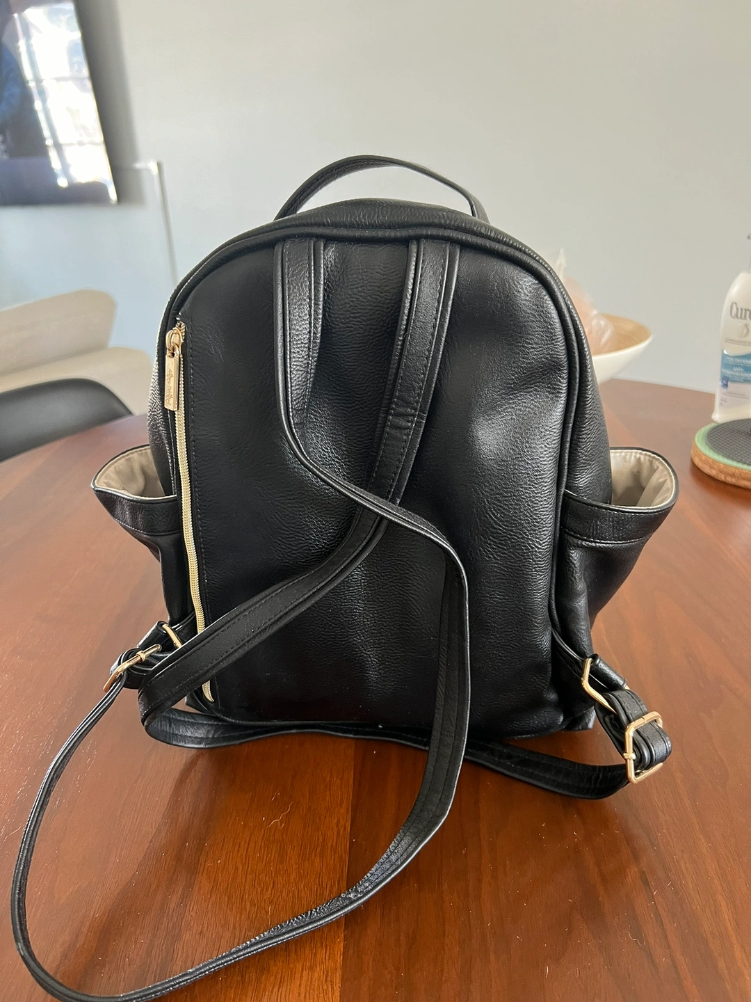 Black Itzy Ritzy backpack with gold hardware. The backpack features several pockets and is perfect for a diaper bag, work bag, or travel.