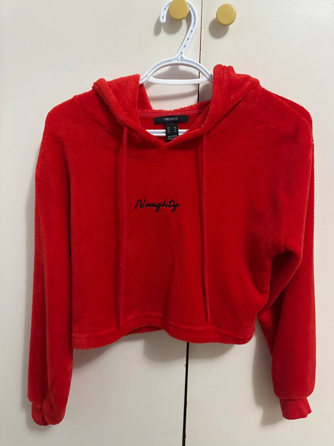 Selling a cute Forever 21 hoodie in size XS! It's a vibrant red colour and has the word "Naughty" embroidered on the front. Perfect for adding a pop of colour to your wardrobe!