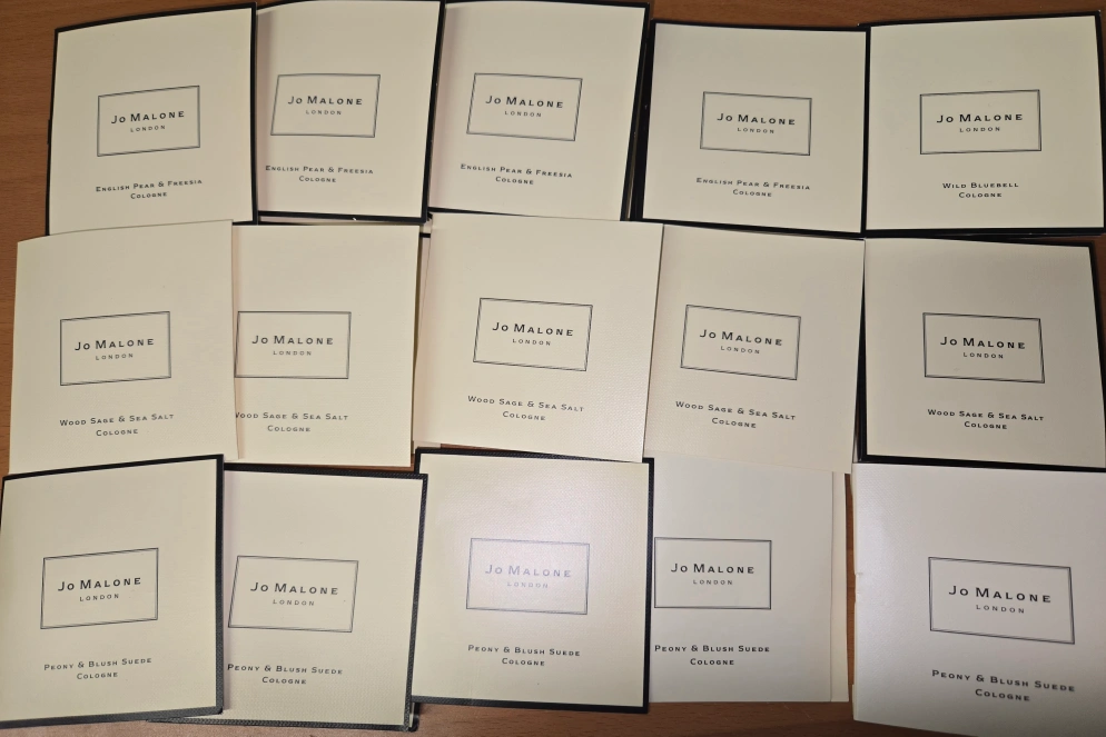 A collection of Jo Malone cologne samples, including scents like English Pear & Freesia, Wood Sage & Sea Salt, Wild Bluebell, and Peony & Blush Suede. Perfect for trying out different fragrances. All 15 for 30$. Can meet at Square One or Sherway Garden