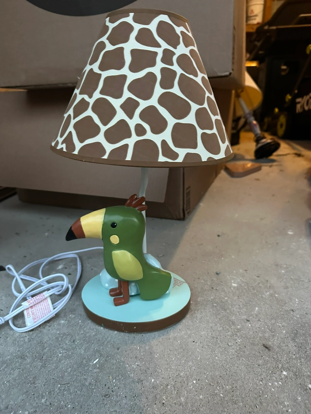 This lamp is a great addition to a child's room or a nursery. It features a toucan on a cloud base and a giraffe print shade. The lamp is in good condition.