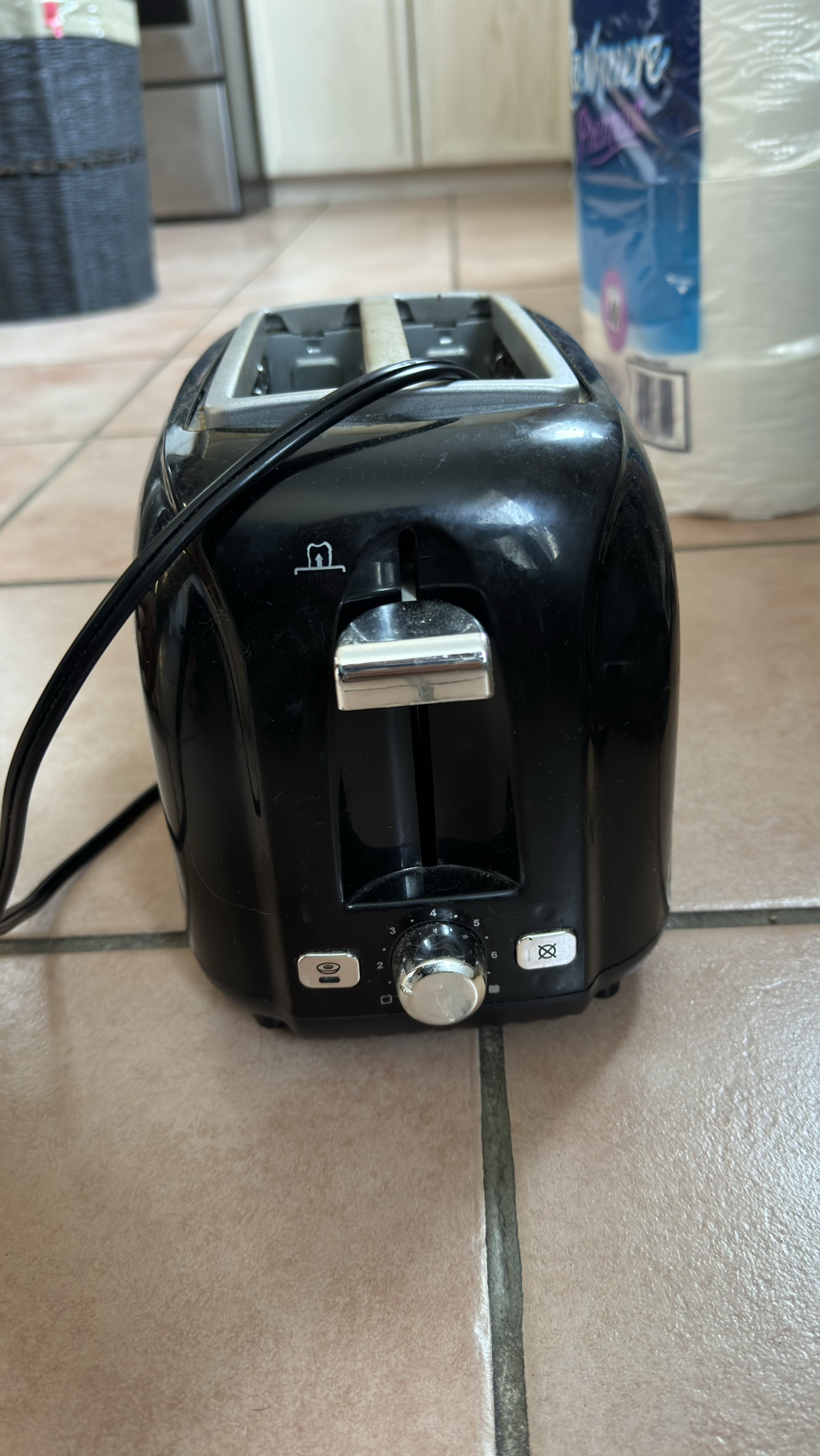 This toaster features a black finish with a silver lever and knob. It has two slots and a reheat function. It is in used condition.