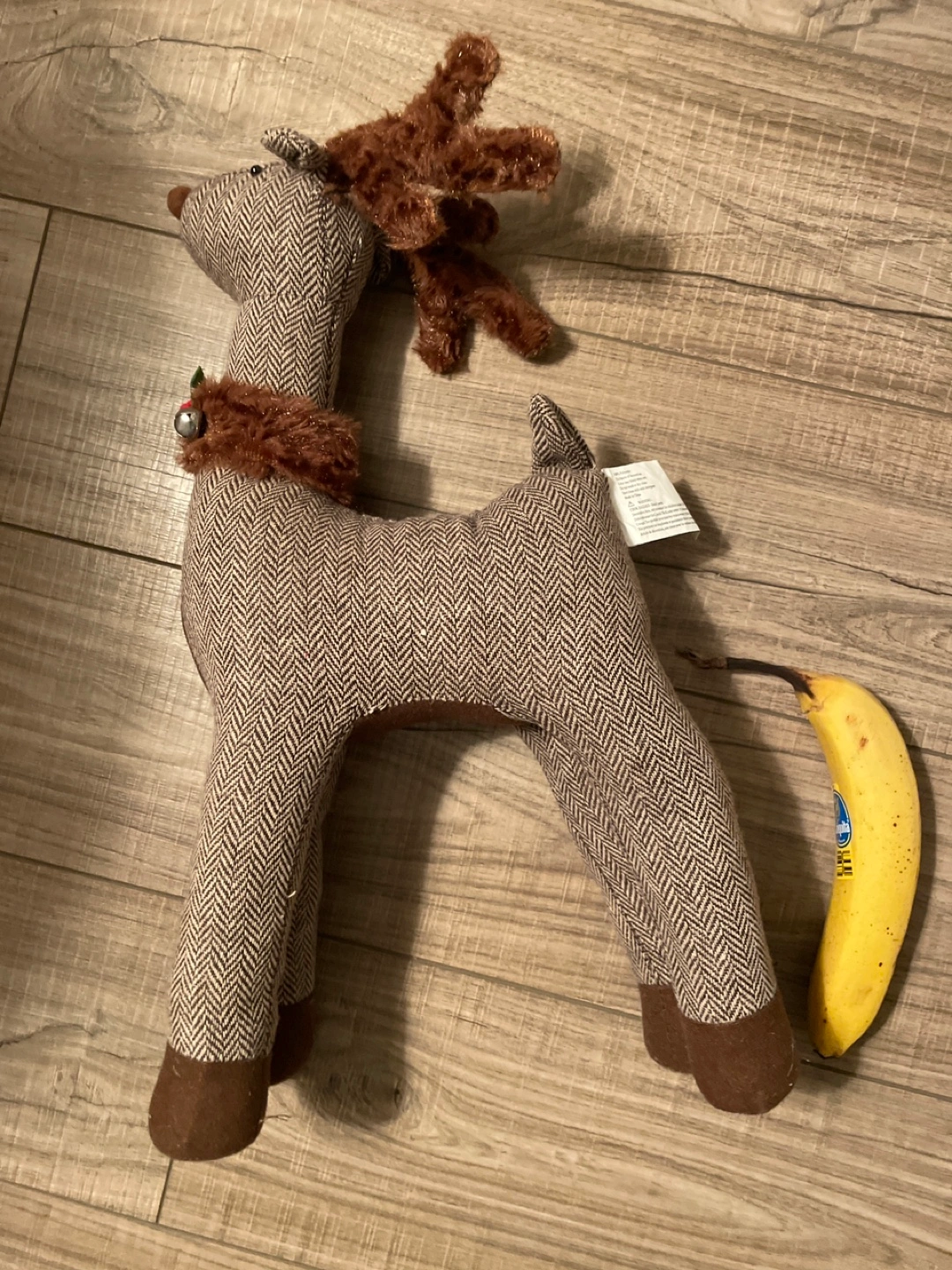 A large, brown and white plaid reindeer with a brown, furry nose and antlers. The reindeer has a brown, fuzzy collar with a red berry and green leaves attached.