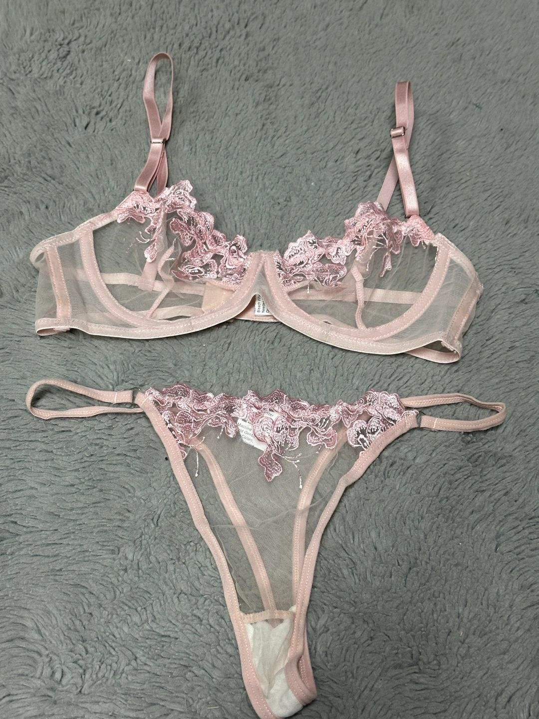 This is a two-piece set including a bra and panty. Both pieces are made of a sheer mesh with delicate floral embroidery.