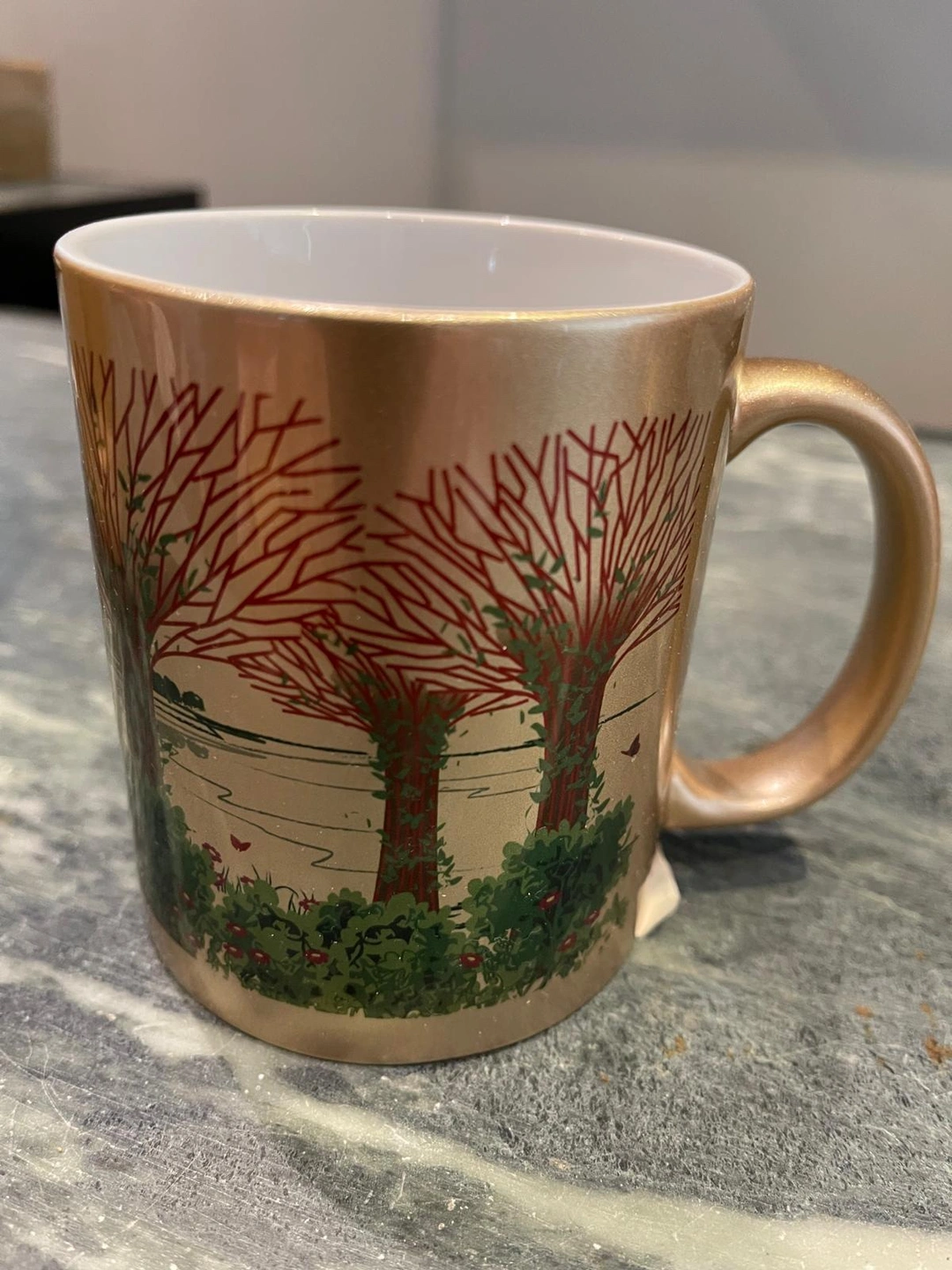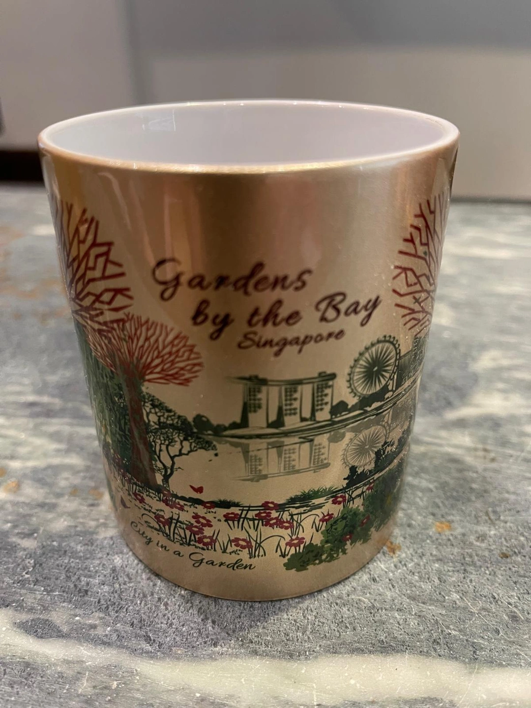 Gold coloured mug with Gardens by the Bay design.Singapore. Pick up in Oakville.