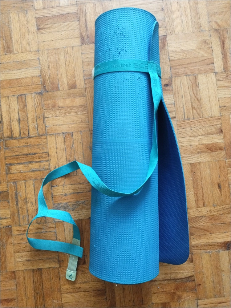 1000+Blue Yoga mat with a carrying strap. has a few cat scratches on it