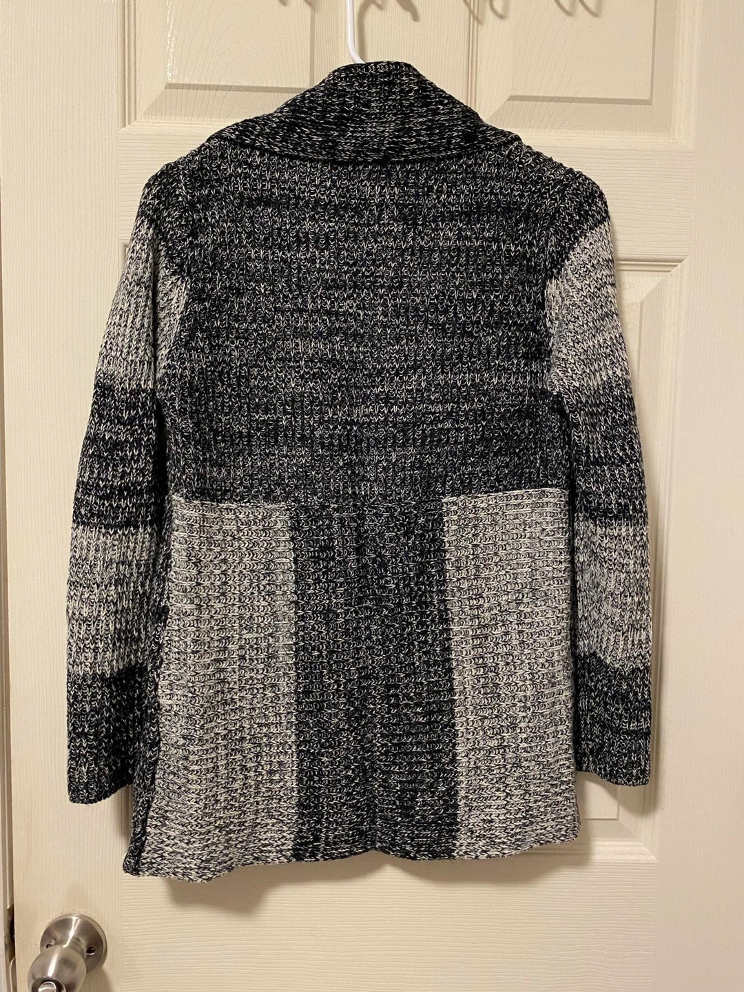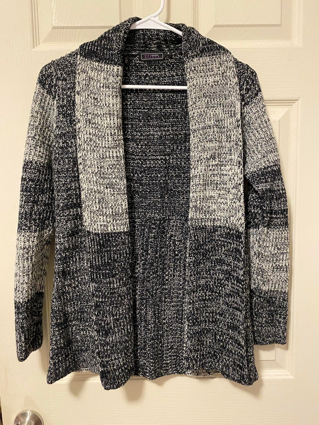 Black and white knit cardigan with long sleeves and an open front. It has a soft, comfortable feel and would be perfect for layering on chilly days. It has a size S tag.