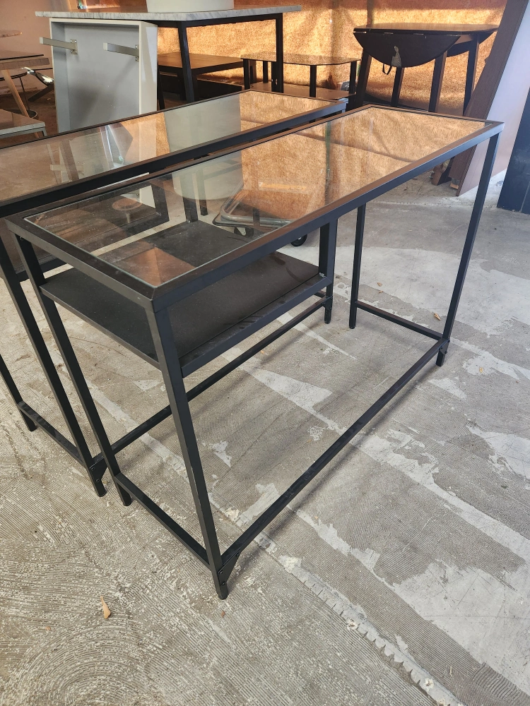 glass top console tables with black metal frames. Each table has a lower shelf, great for entry ways or smaller spaces.