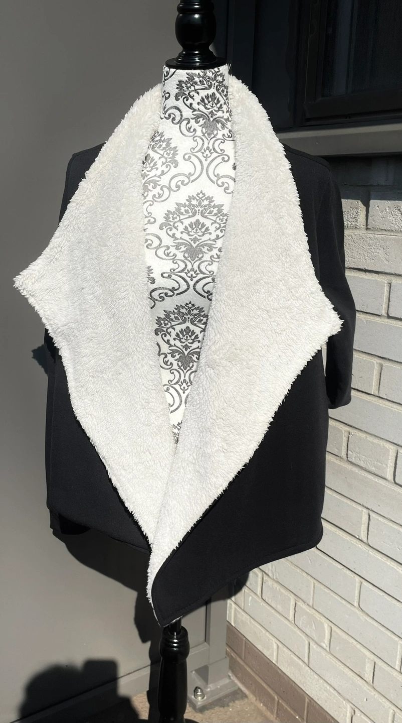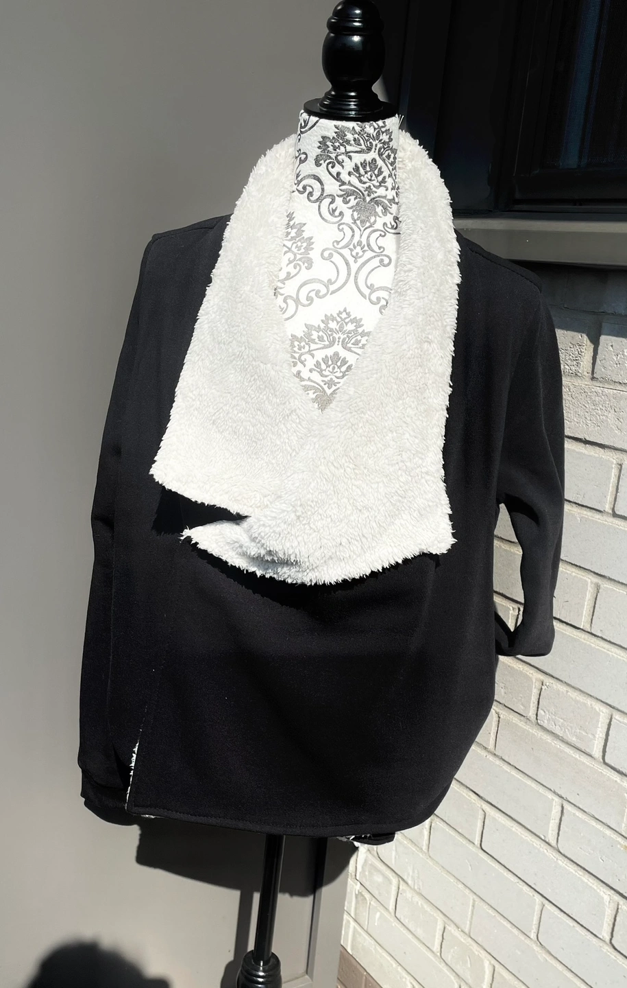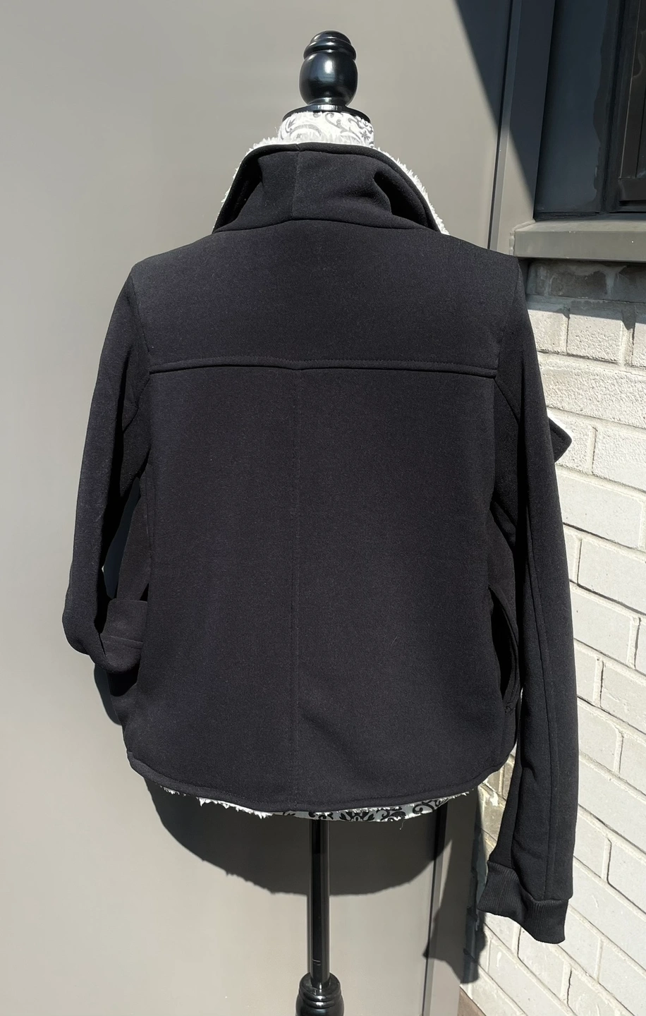 Long-sleeved jacket with a fleece collar.body is lined with fleece not the sleeves