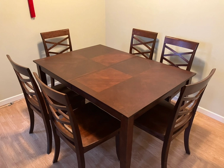 A dark solid wood dining table set with 6 chairs. The table is approximately 42 inches wide. Length is extendable from 5ft to 6ft. From a smoke free pet free home.