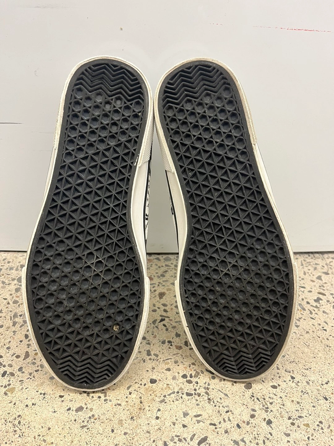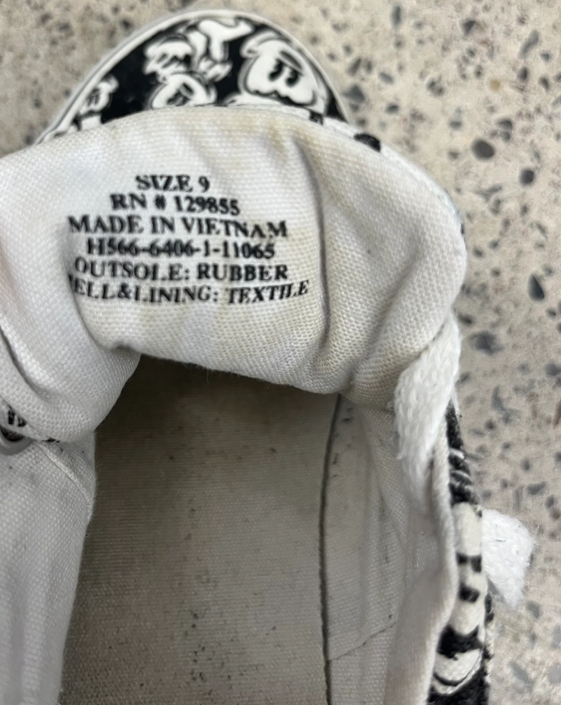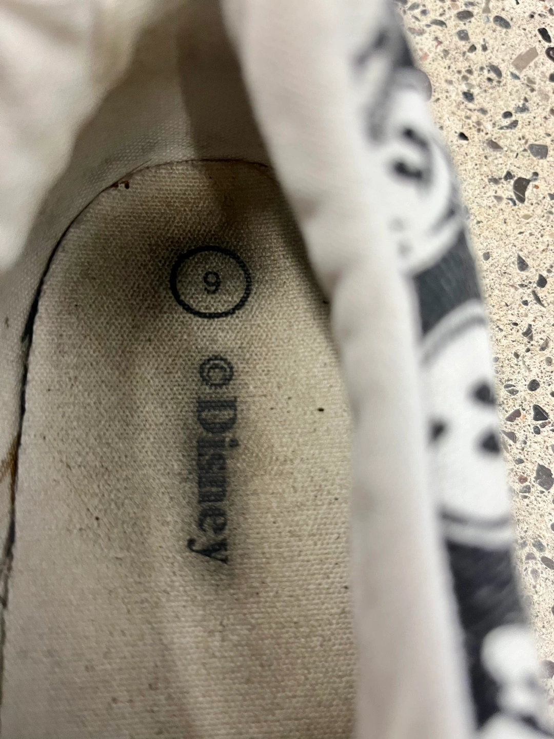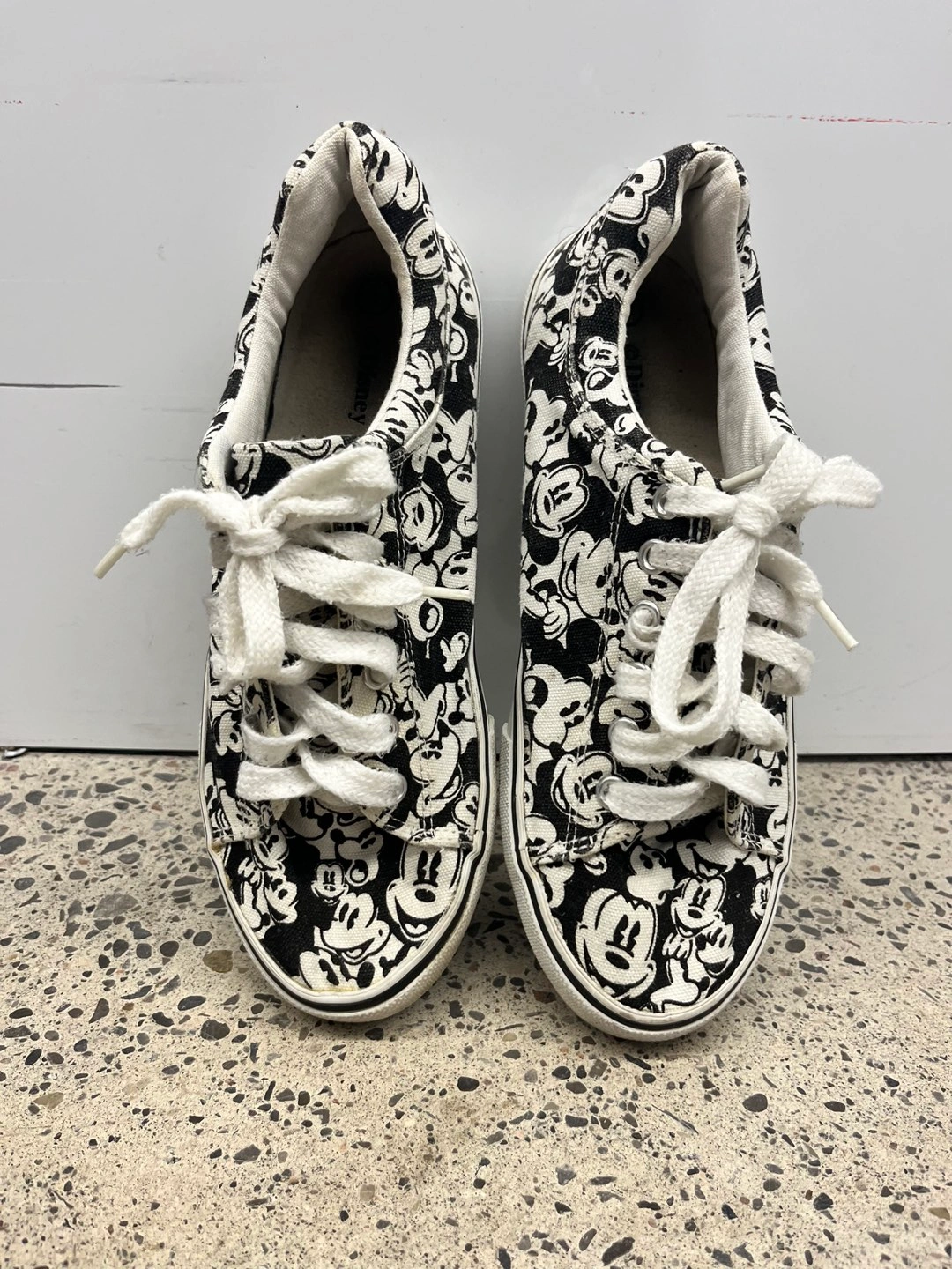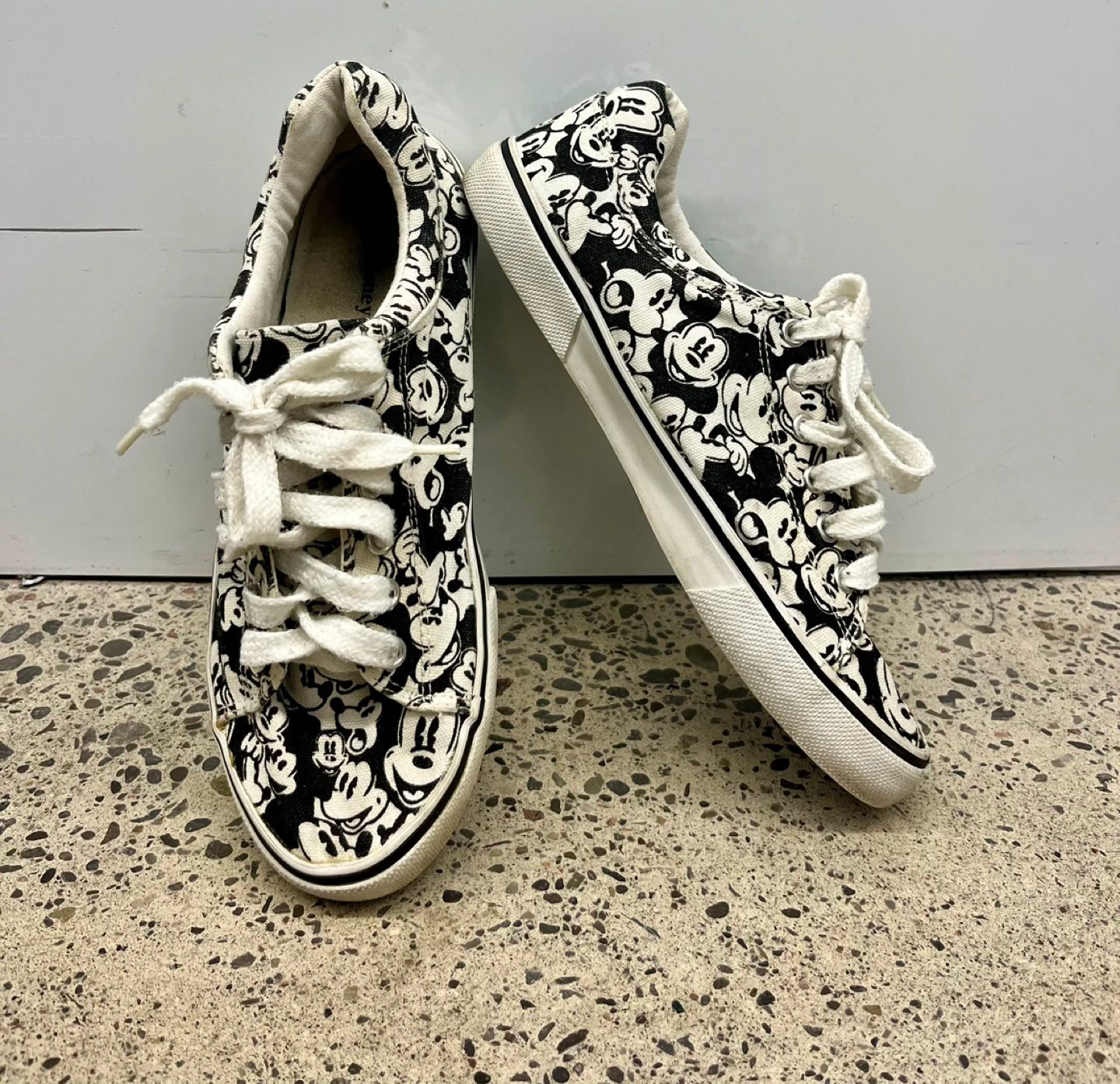 165Preloved size 9 blk and wht Mickey Mouse all over print canvas shoes All sales final. Curbside pick-up Woodbine and Gerrard