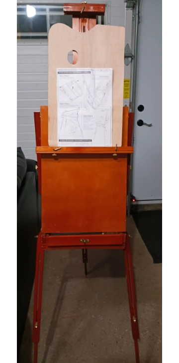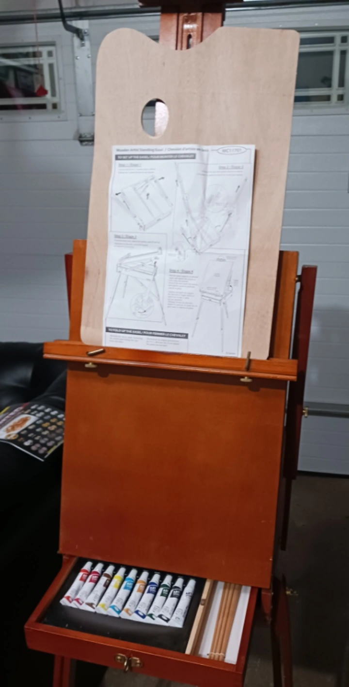 A wooden artist's easel with a storage drawer. Includes a set of paints, brushes and a palette. Last picture is one from Amazon that is almost exact but think different make. Brand new, never used, only set up for pictures.The price listed is bec of minor scrapes from moving which doesn't affect quality. I need something a little safer to have around small children, reason selling, just collecting dust in this home.