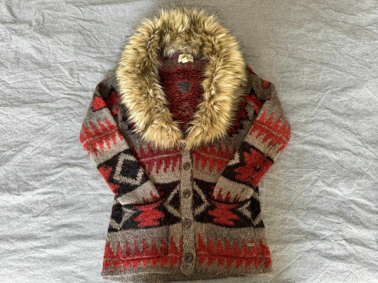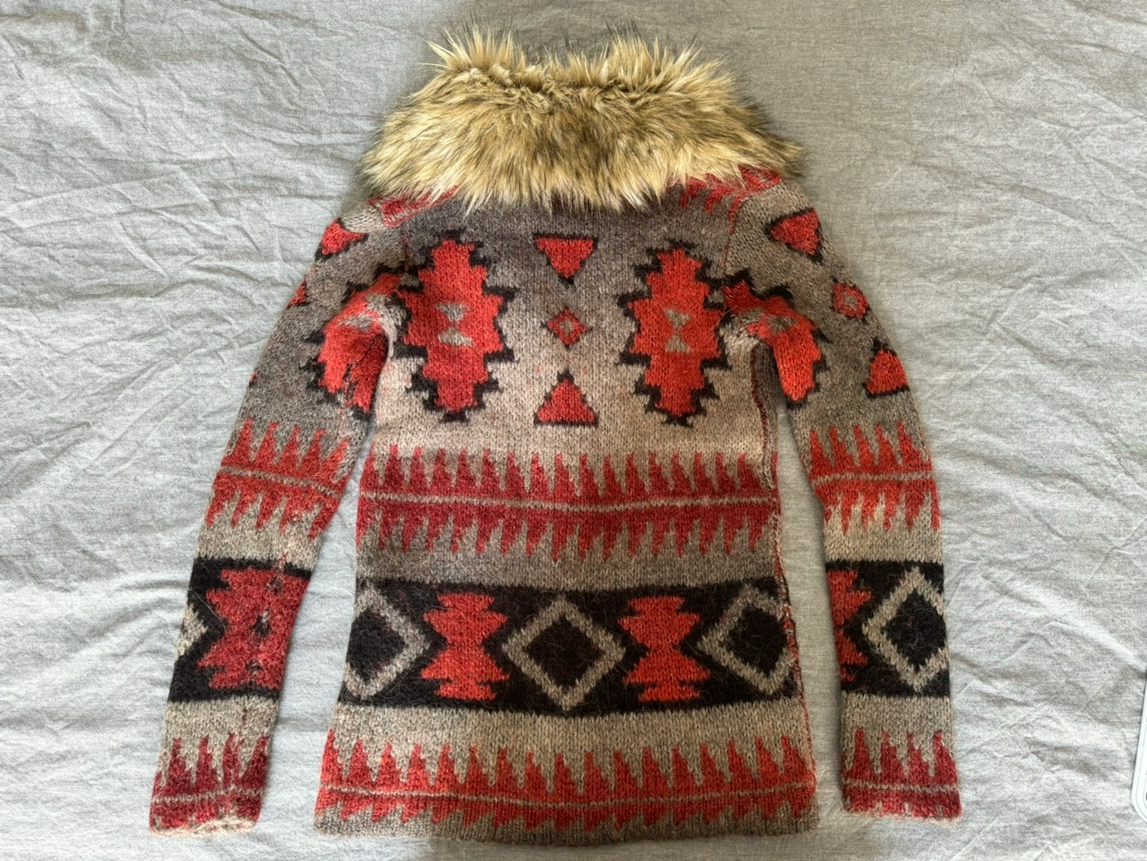 Denim & Supply Wool & Alpaca blended long-sleeved cardigan with a faux fur collar and a geometric pattern.