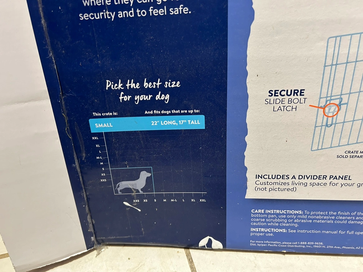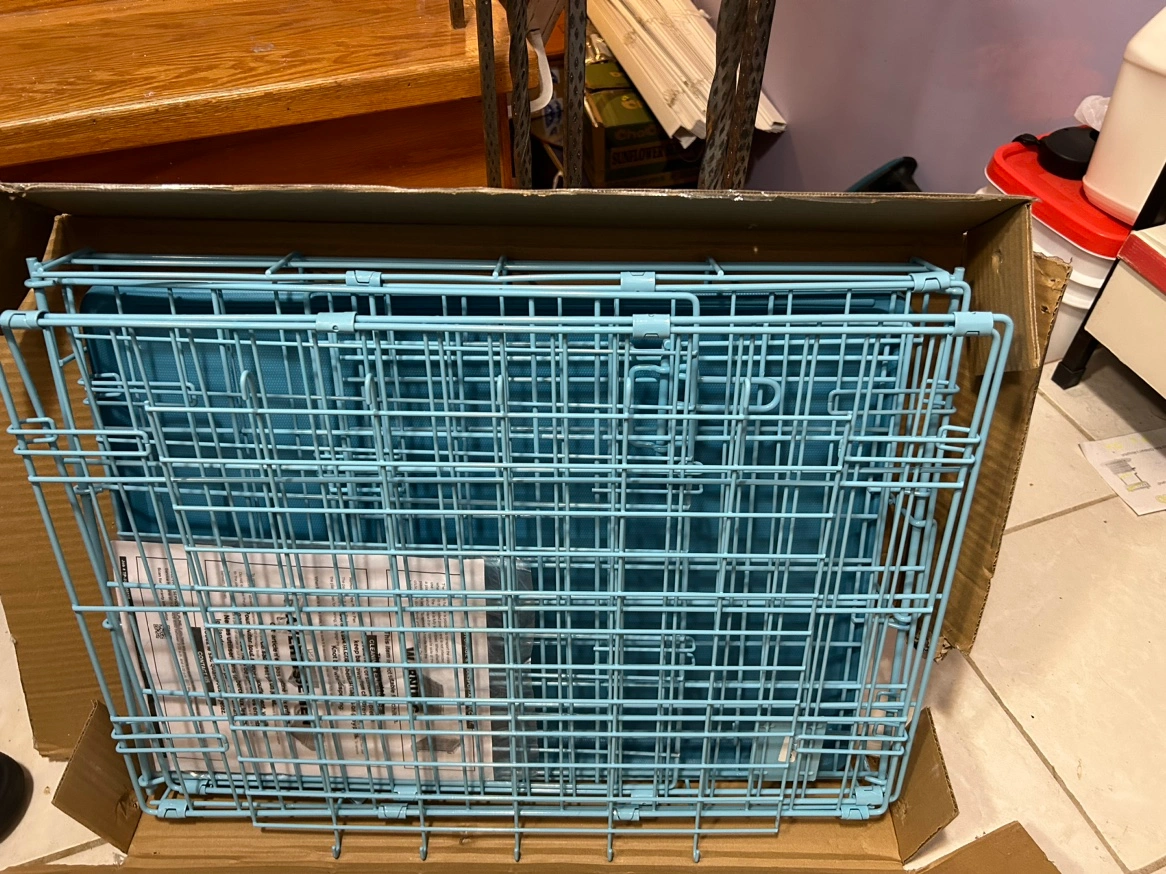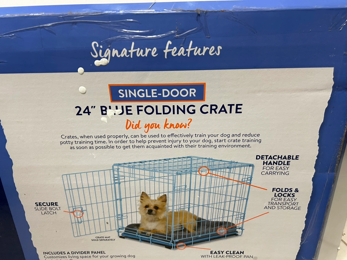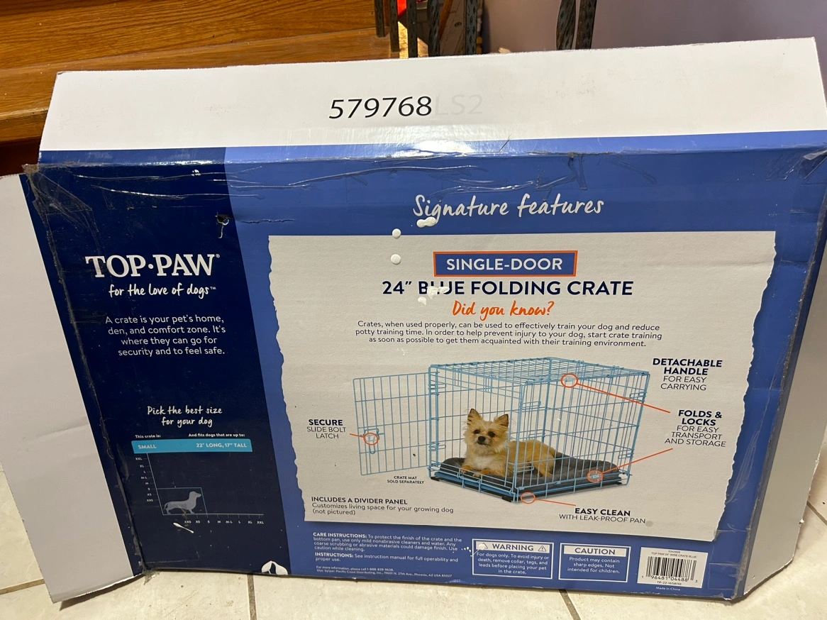 756This is a Top Paw brand single-door folding dog crate. It is blue and is brand new, still in the original box. It includes a divider panel and a leak-proof pan. It is 24 inches long and the door is on the side. The crate is made of sturdy metal and folds flat for easy storage.