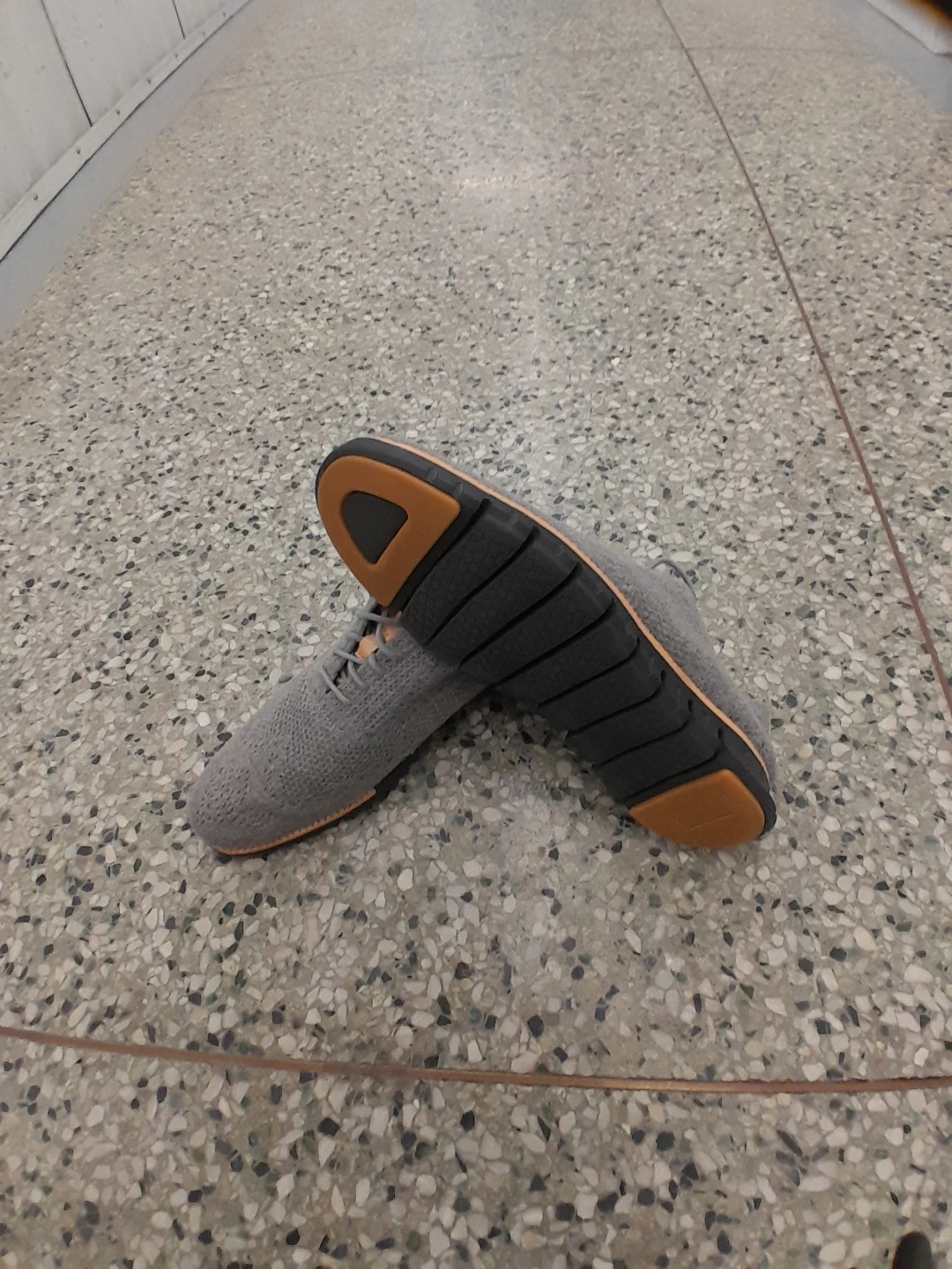 These grey knit shoes have a dress shoes style. They feature a cushioned sole with tan accents. This footwear offers a comfortable and casual look Men's size 10