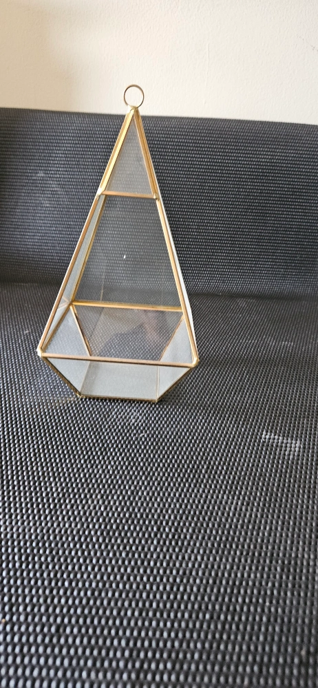 Geometric glass terrarium with a gold frame. It has a small loop on top for hanging. Perfect for plants or decorative objects.