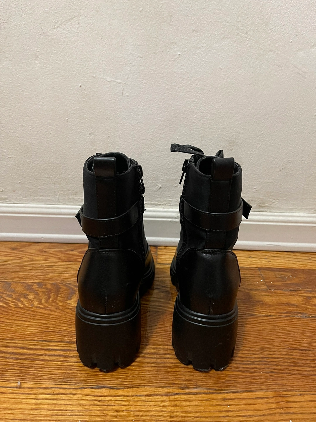 235These are black combat boots with a buckle and lace-up closure. Still in a good condition Cash ๐ต Pick Up