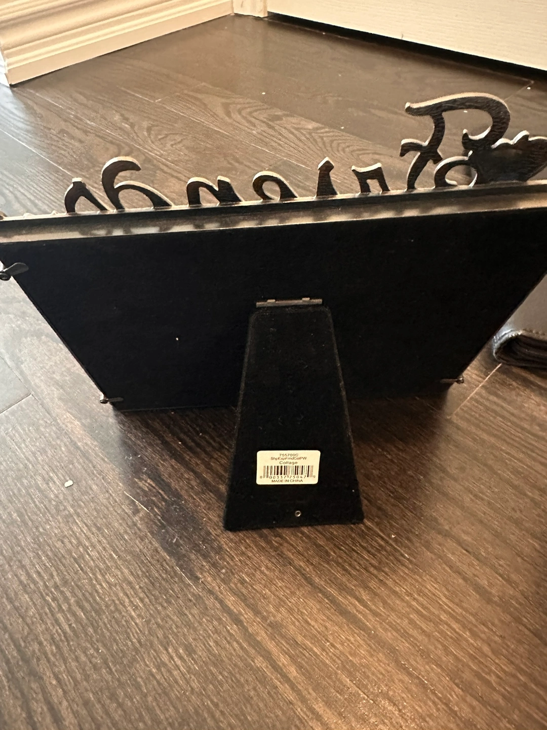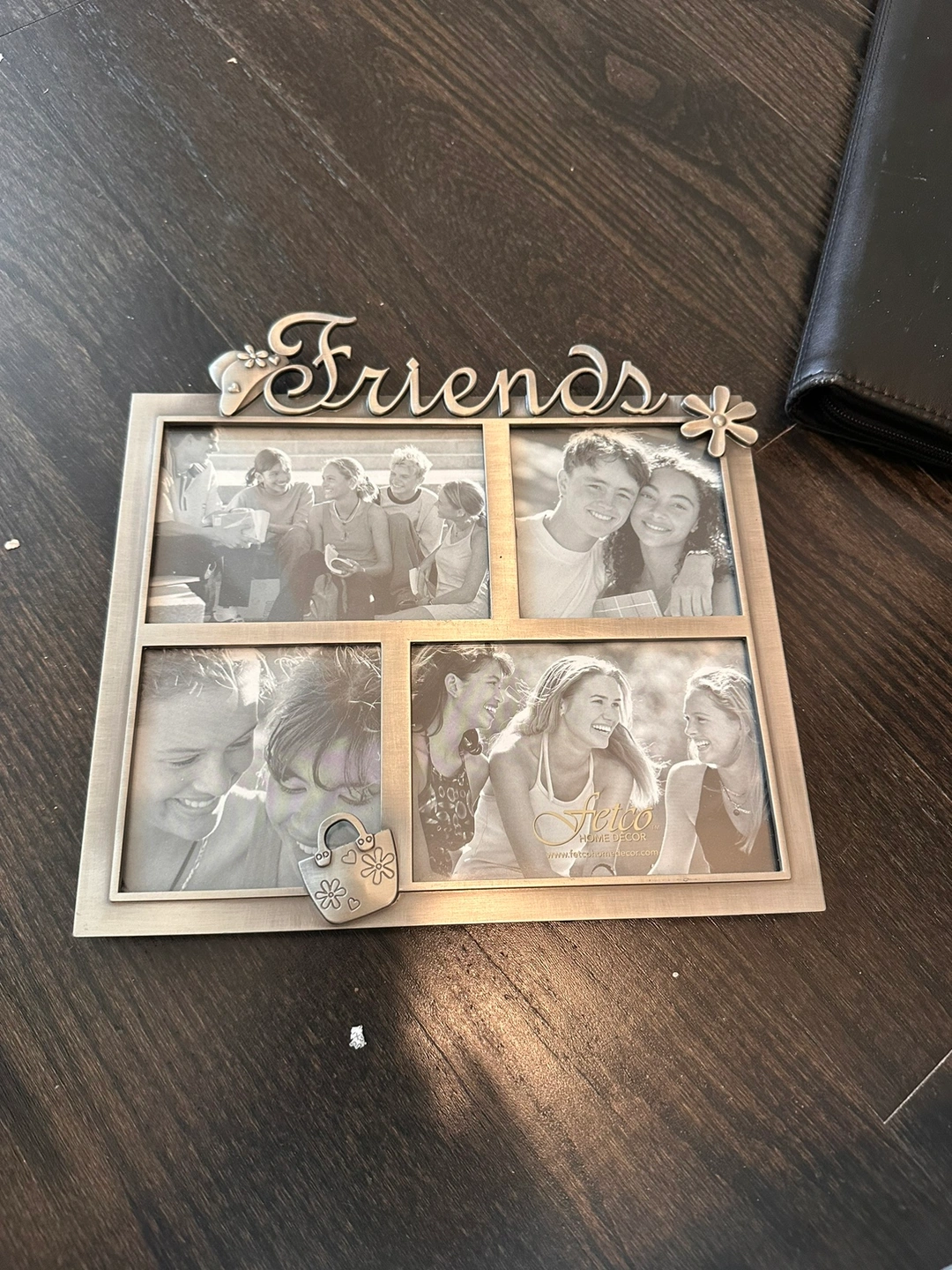 Four-photo picture frame that stands upright. The frame has silver accents and the word "Friends" etched into the frame.