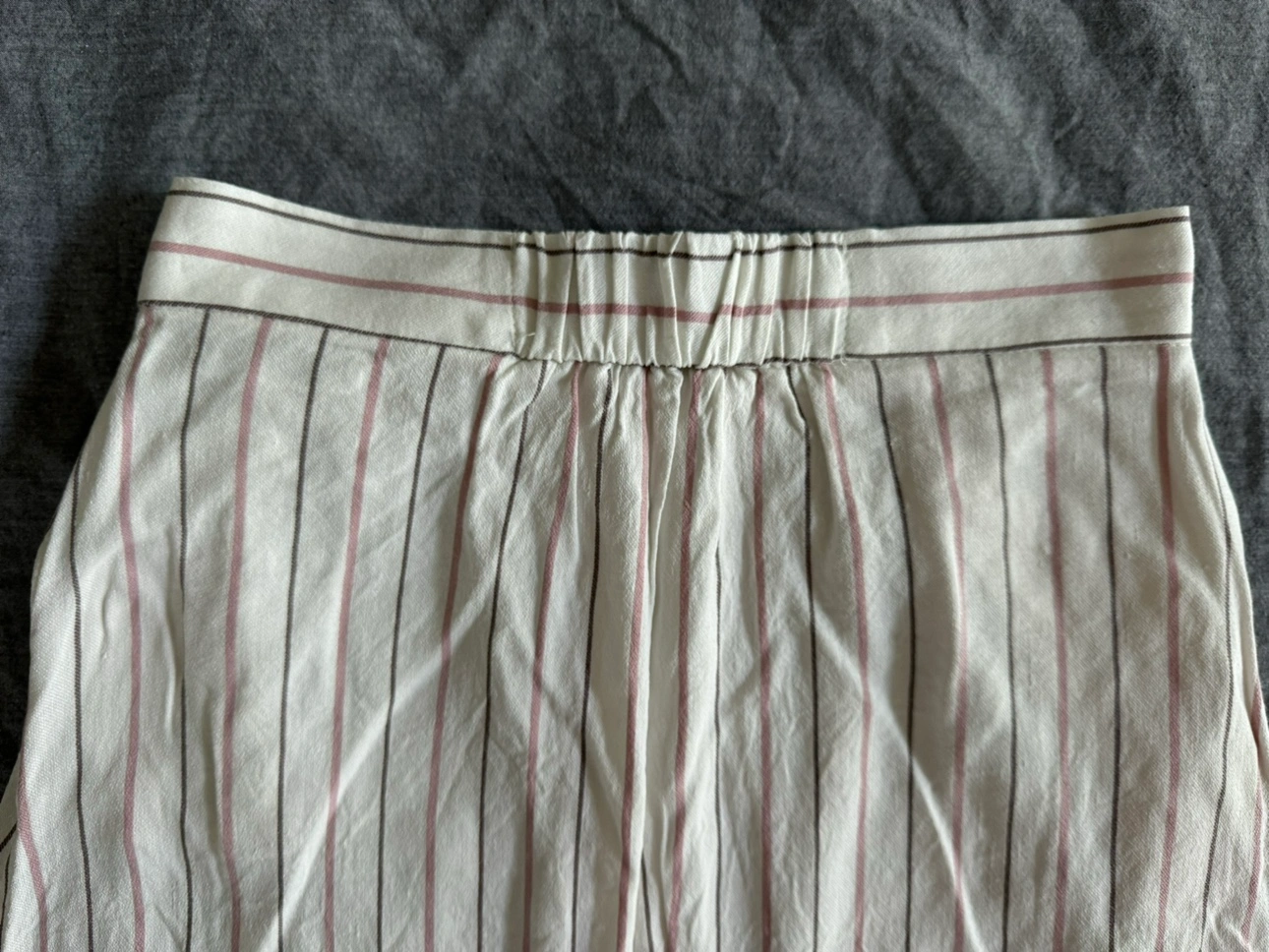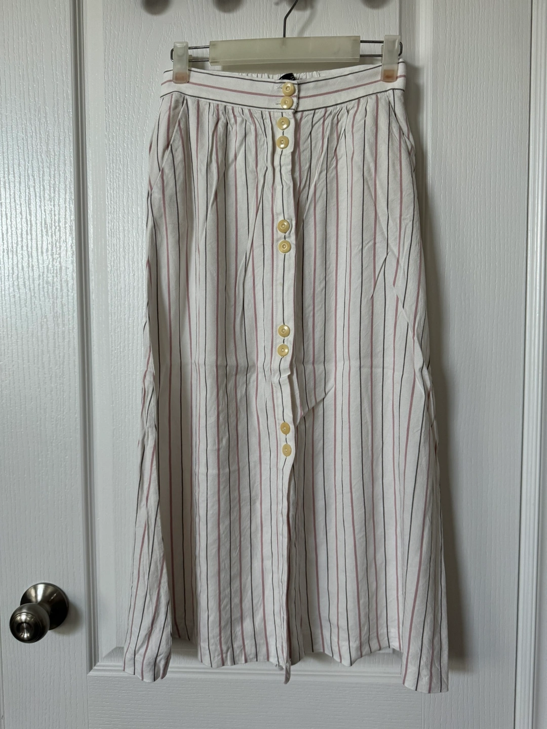 Zara white skirt with pink and black stripes and a button-up front. Hand pockets.