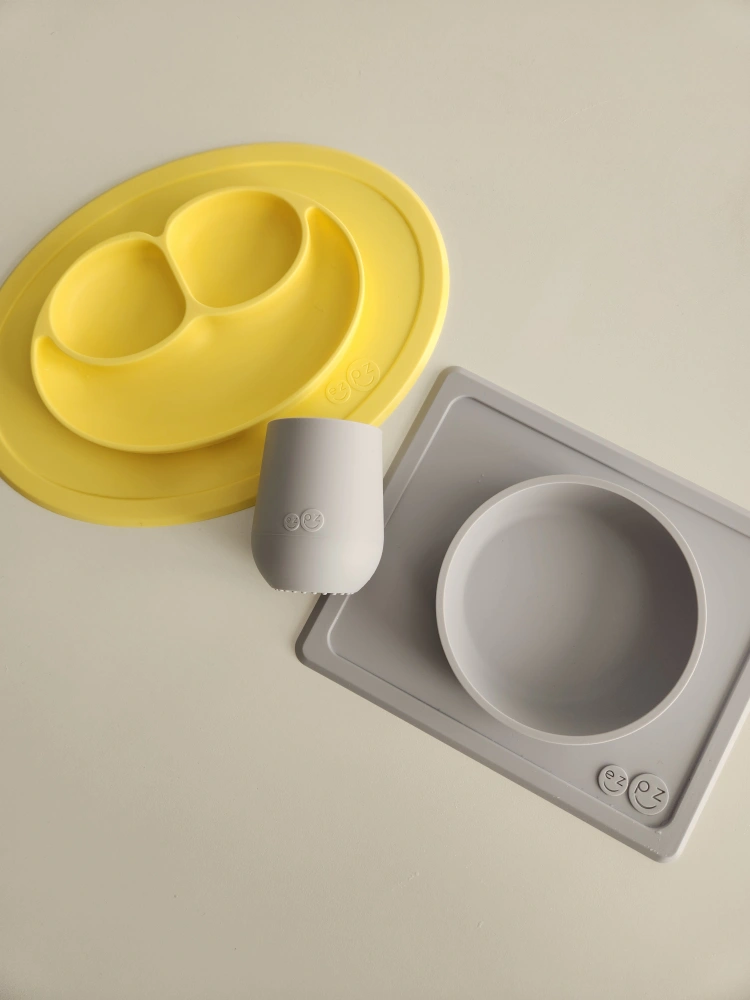 Free with another baby item purchase 1) Ezpz mini mat- Lemon 2) Ezpz mini bowl- Pewter 3) Ezpz tiny cup- Pewter Bonus if you want it: Ezpz mini mat- Pewter, slightly damaged as shown All items- Dishwasher and microwave safe Plates/bowls- Suction Cup- Weighted to reduce tipping Pickup near Major Mackenzie & Bathurst