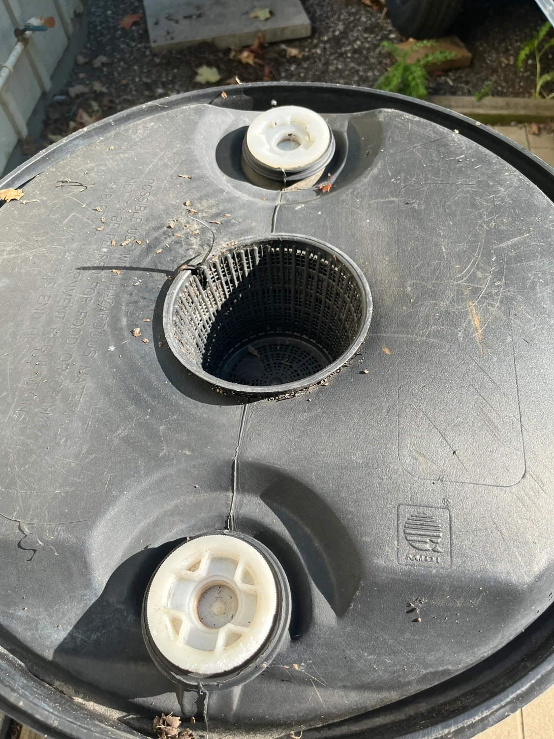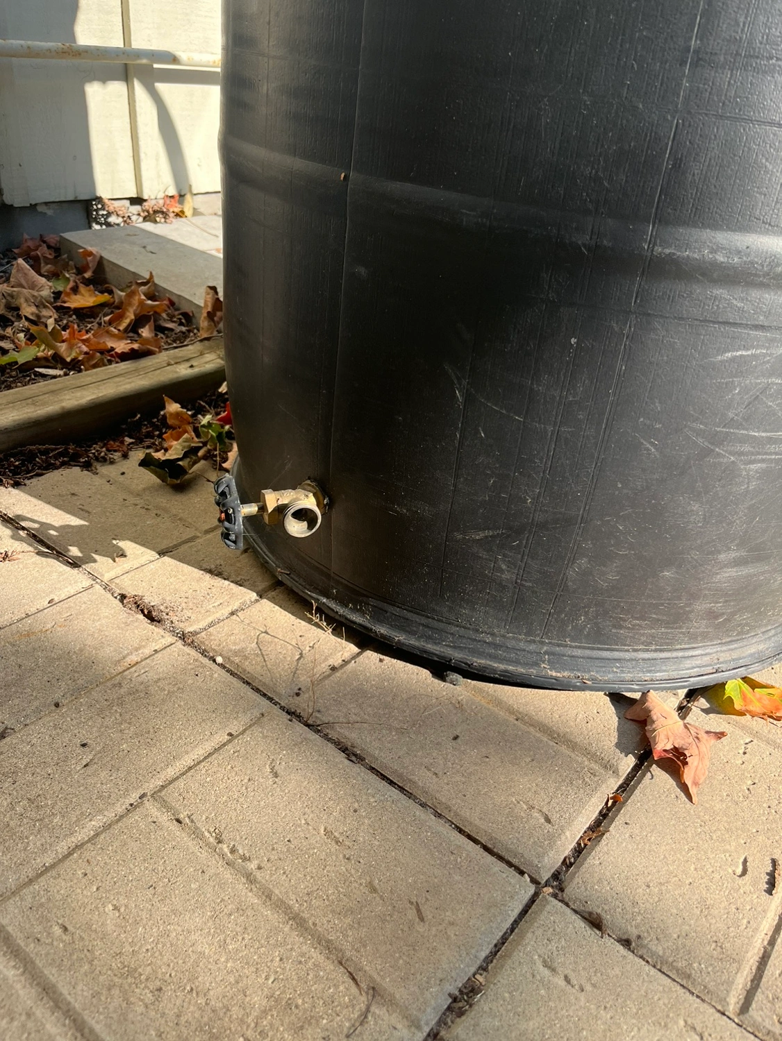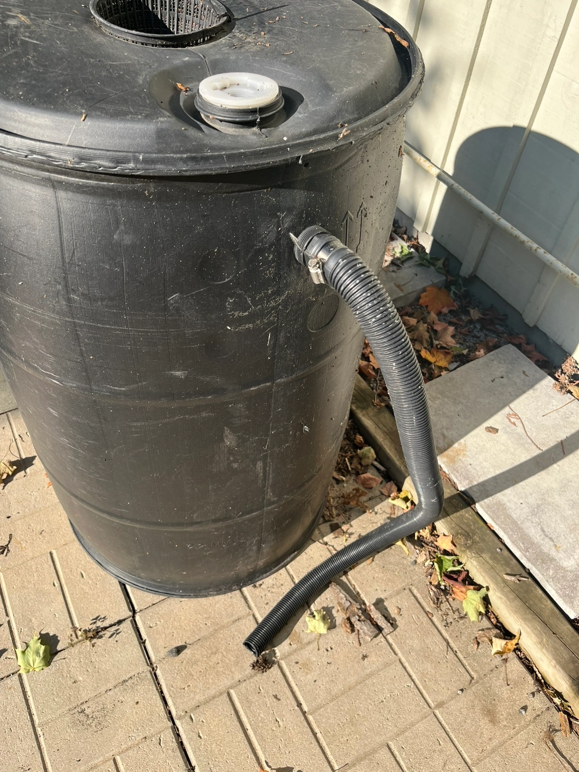 Large black rain barrel with a tap and a hose. Includes screen and lid. Suitable for collecting rain water. A great way to water plants and save money on your water bill.