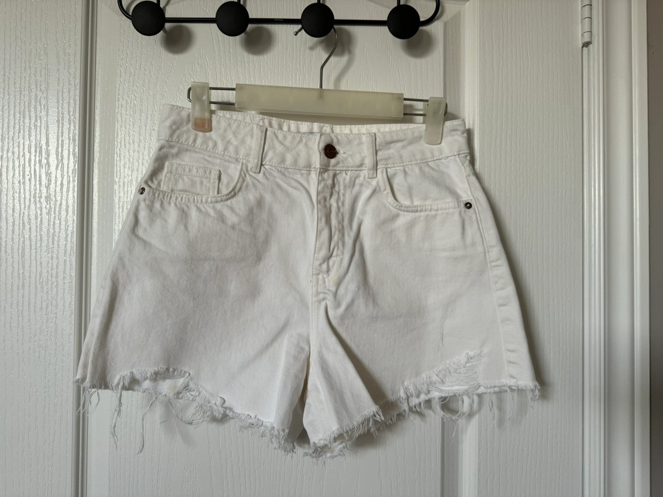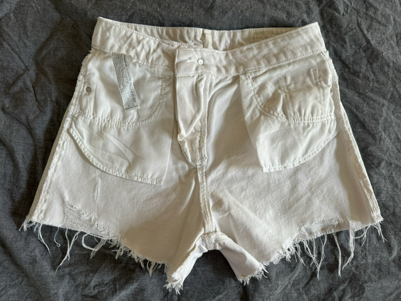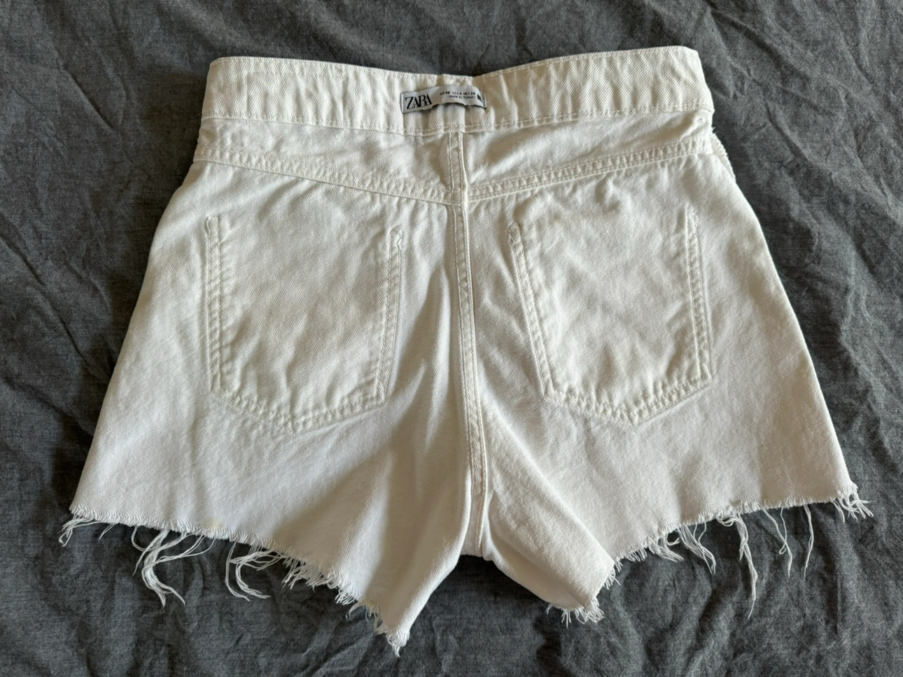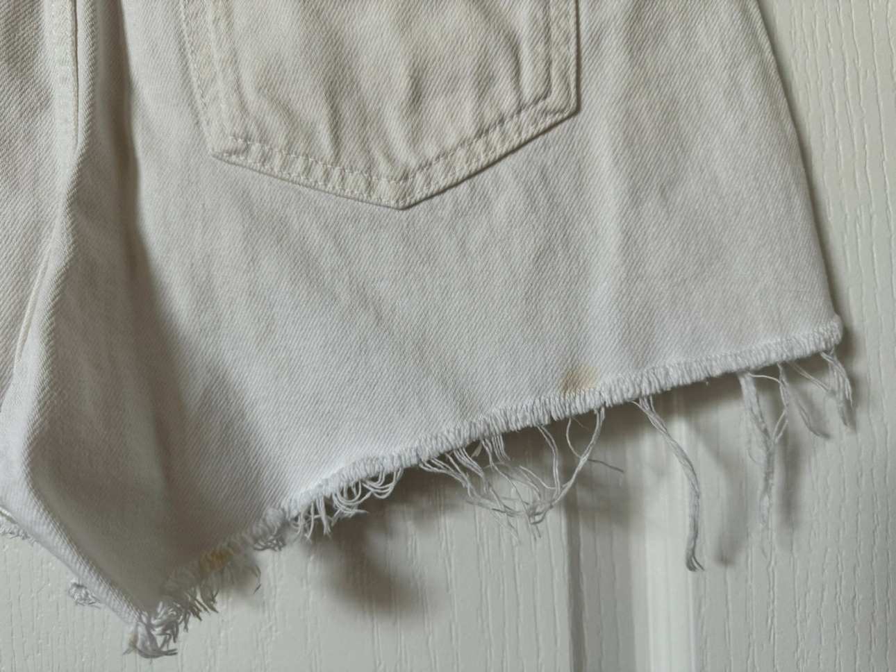 140Pick up at 16th Ave & Kennedy Zara. High waisted, distressed denim shorts. These shorts have a button and zipper closure. The waist is approximately 34" and the inseam is approximately 3". Size seam 30”. Please note that the shorts are not new and have 2 stains (Bleach could remove the stains).