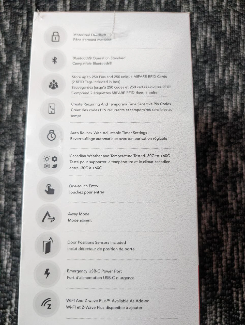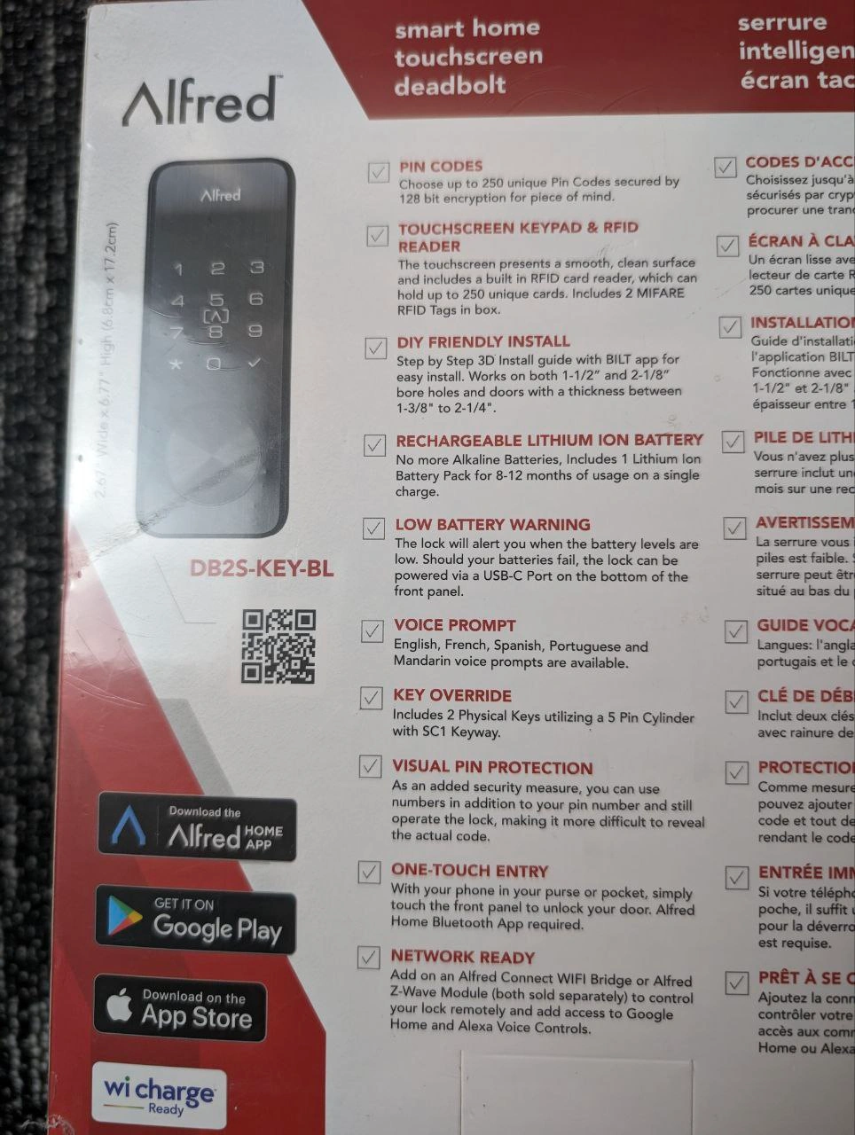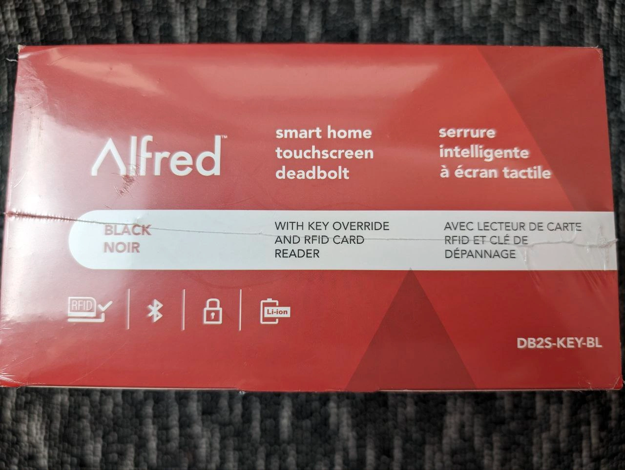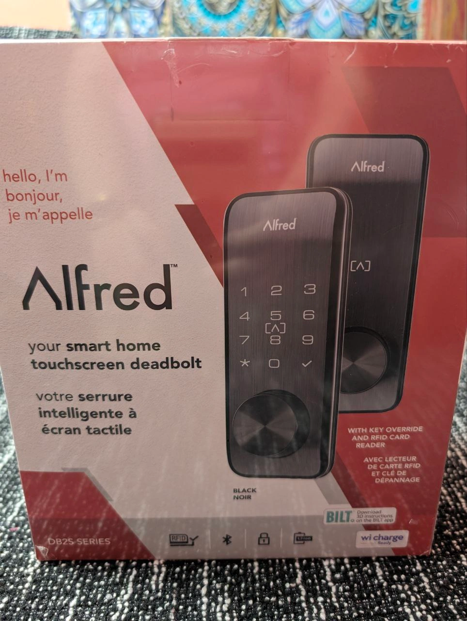 * Factory sealed, never used * Stainless steel, black * Includes an RFID card and a key * Can be controlled via phone app * Works with Amazon Alexa, iOS, Android * Re-lock feature with programmable timing * Door position sensors included * USB charge with low charge warning Current Amazon.ca price for Alfred DB2S Smart RFID Deadbolt Lock with Key: $349.95. You get this brand new, never used item at a really good price and pickup for free. Bought it for a gift, but never got around to giving it. Box is unopened, sealed by the manufacturer, and the device is completely brand new. Cash only. Pickup in Etobicoke or Mississauga: Email us to make arrangements. +++++ Smart Home Lock - RFID Deadbolt Lock - Key Override - Black Deadbolt - Pin Code Lock - Smart Deadbolt - Home App - Mobile Controlled Lock - Alfred Connect V2 WIFI - Remote Lock Control - Hey Google Compatible - Alexa Compatible - Auto Re-lock Feature - Adjustable Re-lock Timer - Door Position Sensors - Low Battery Warning - USB-C Emergency Access - Rechargeable Lithium-Ion Battery - Bluetooth Connectivity - iOS Smart Lock - Android Smart Lock - 250 RFID Card Storage - 250 Pin Code Storage - Black Chrome Bezel - Illuminated Touch Screen - DIY Install - Digital Installation - Bluetooth Keys - Digital Keys Sharing - Rental Property Lock - Home Security - Smart Home Device - Secure Deadbolt - Modern Deadbolt - High-Tech Lock - Keyless Entry - Smart Home Security