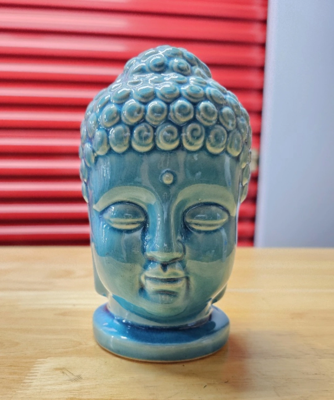 Ceramic Buddha head statue with a light blue glaze. The statue is approximately 5 inches tall. It has a circular base and features a detailed face.