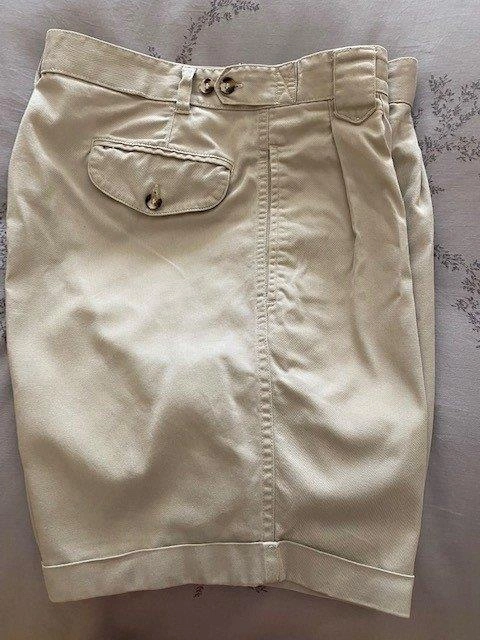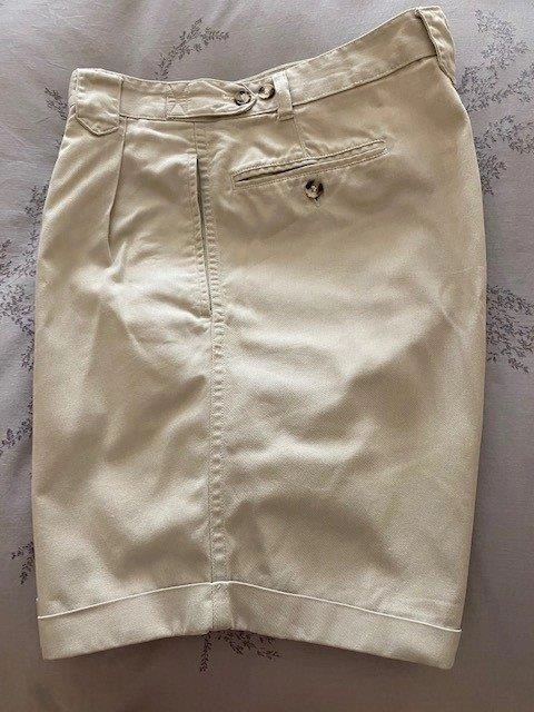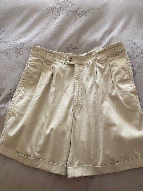 These are a pair of men's beige shorts with side and back pockets. They have pleats at the front. They are made of a lightweight fabric and are perfect for warm weather. They are in excellent condition and have been laundered and pressed. From a pet and smoke free home. Pickup only in the St. Lawrence market area of downtown Toronto. Cash only.