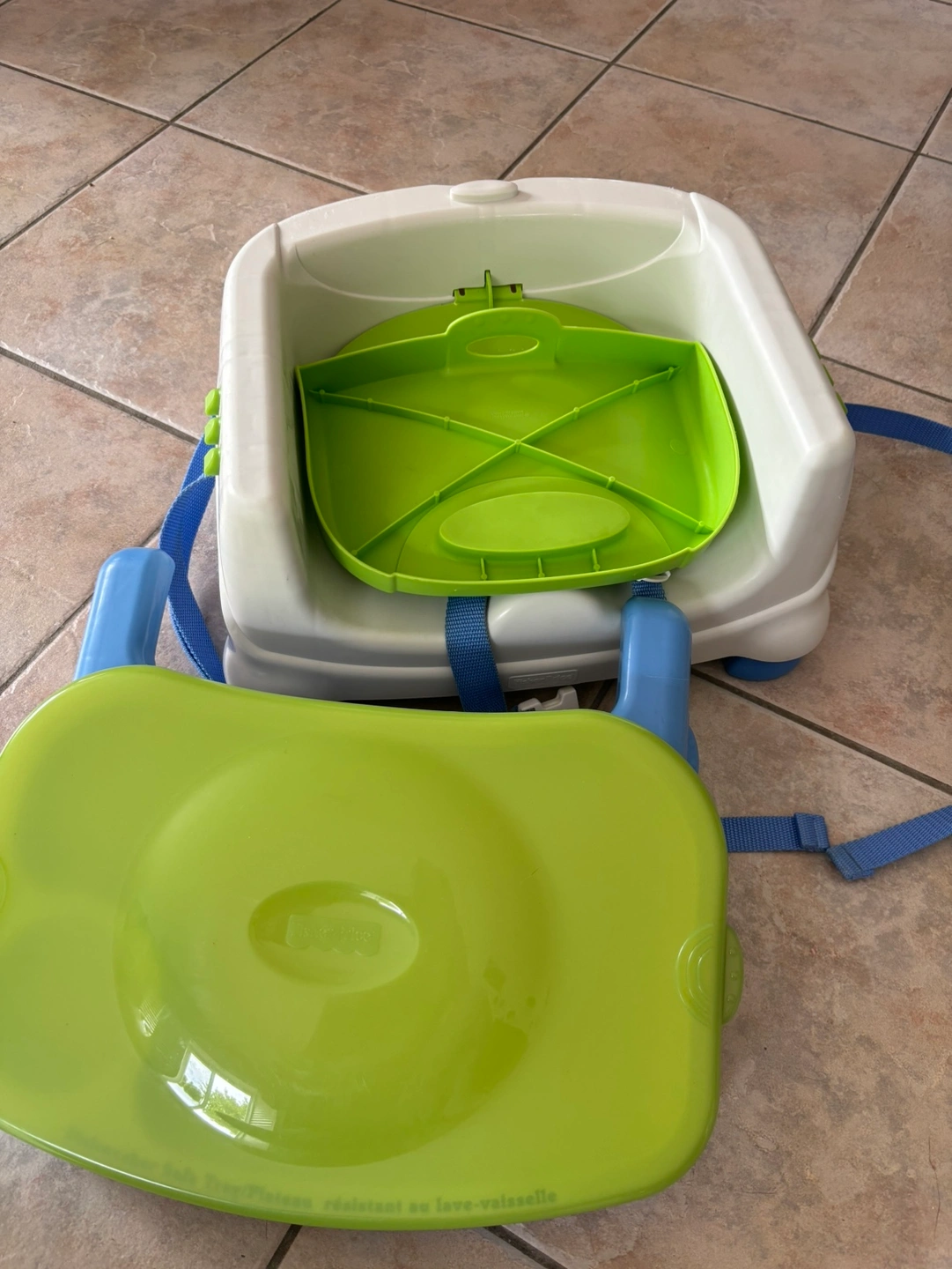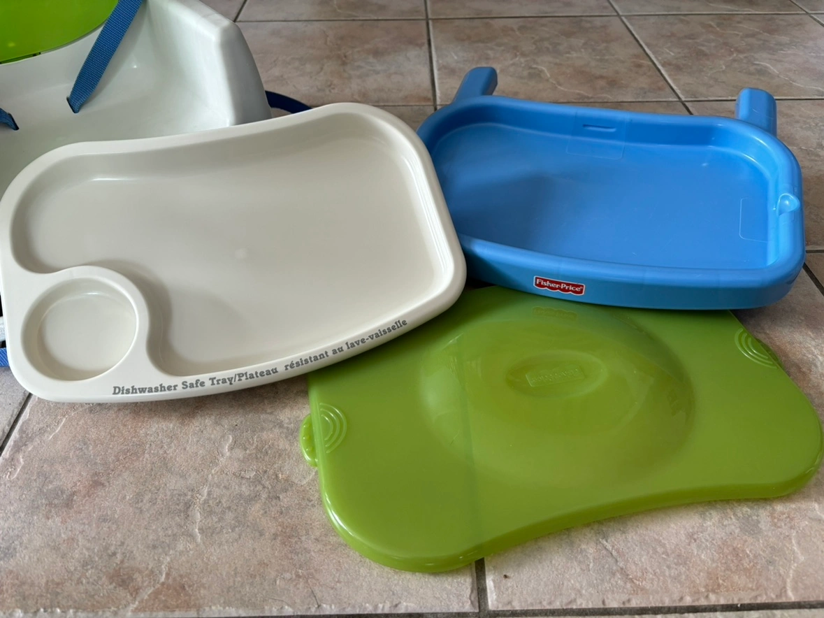 A green and blue Fisher-Price booster seat. It folds up for easy storage. The tray is removable. It has a five point harness. Is in excellent condition