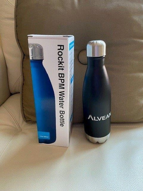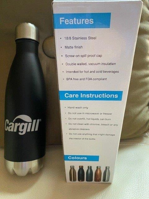 Black stainless steel water bottle with a silver screw-on lid. The bottle has the word "ALVEAN" and “Cargill” printed on the side. The bottle comes in its original box. For either hot or cold beverages, double walked with vacuum insulation. From a pet and smoke free home. Pickup only in the St. Lawrence market area of downtown Toronto. Cash only.