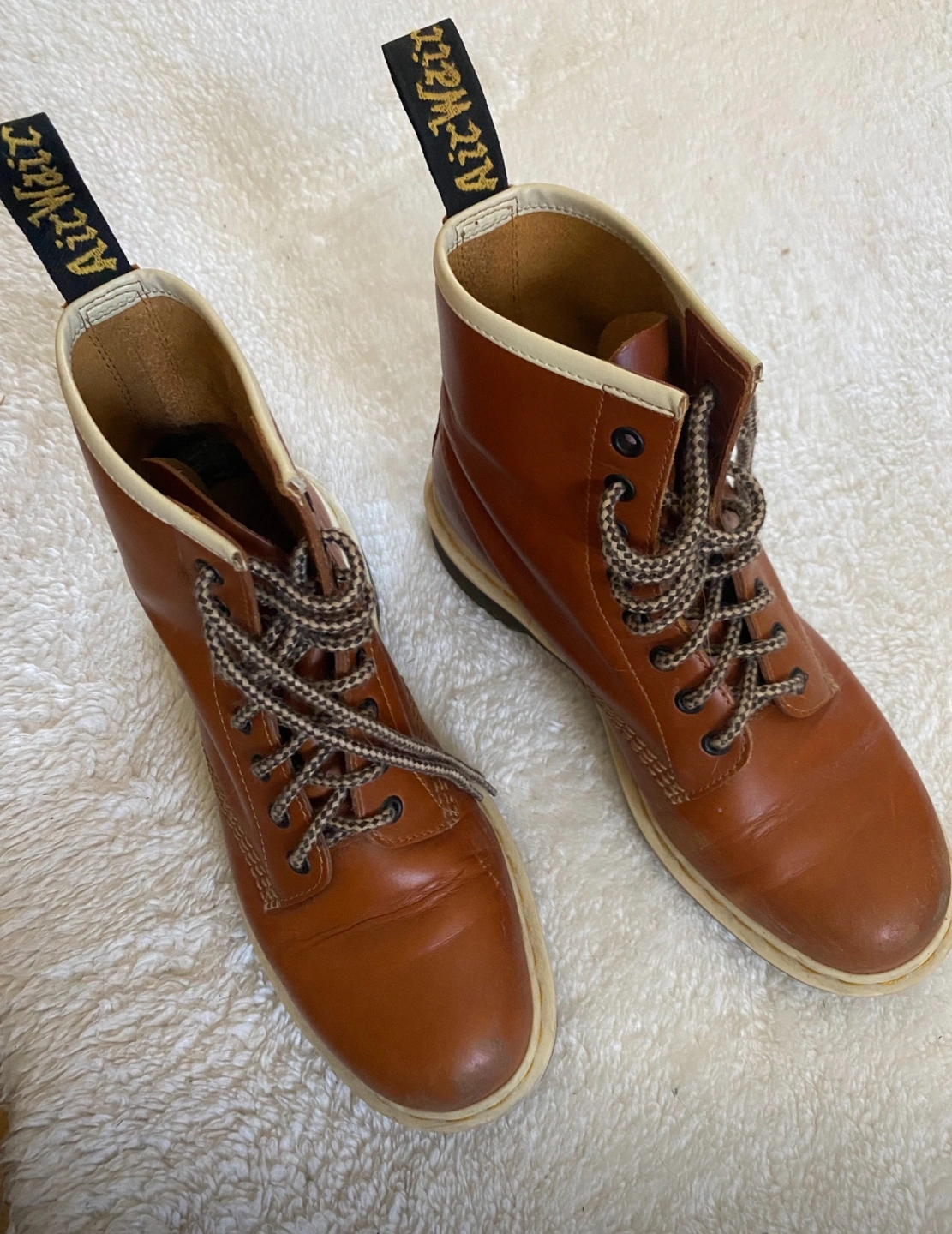 Brown leather Dr. Martens boots with white stitching and laces. They are in good condition and are ready to be worn.
