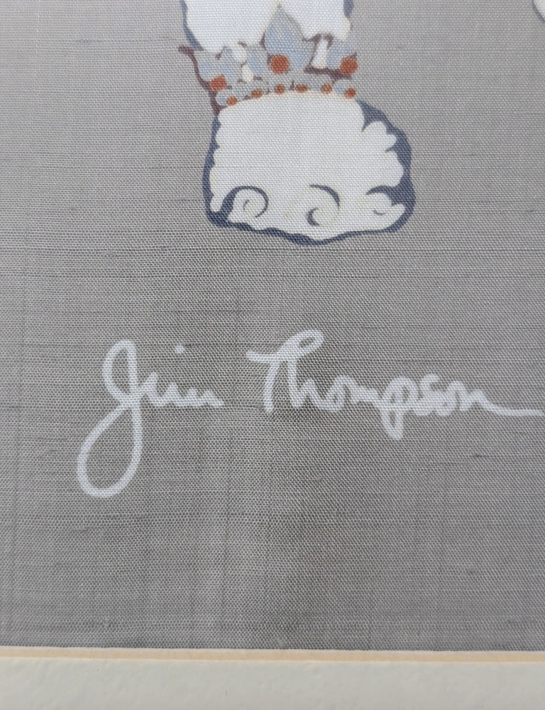 This is a beautiful framed silk fabric print from artist Jim Thompson. The scarf is in very good condition and the frame has Jim's life story attached.