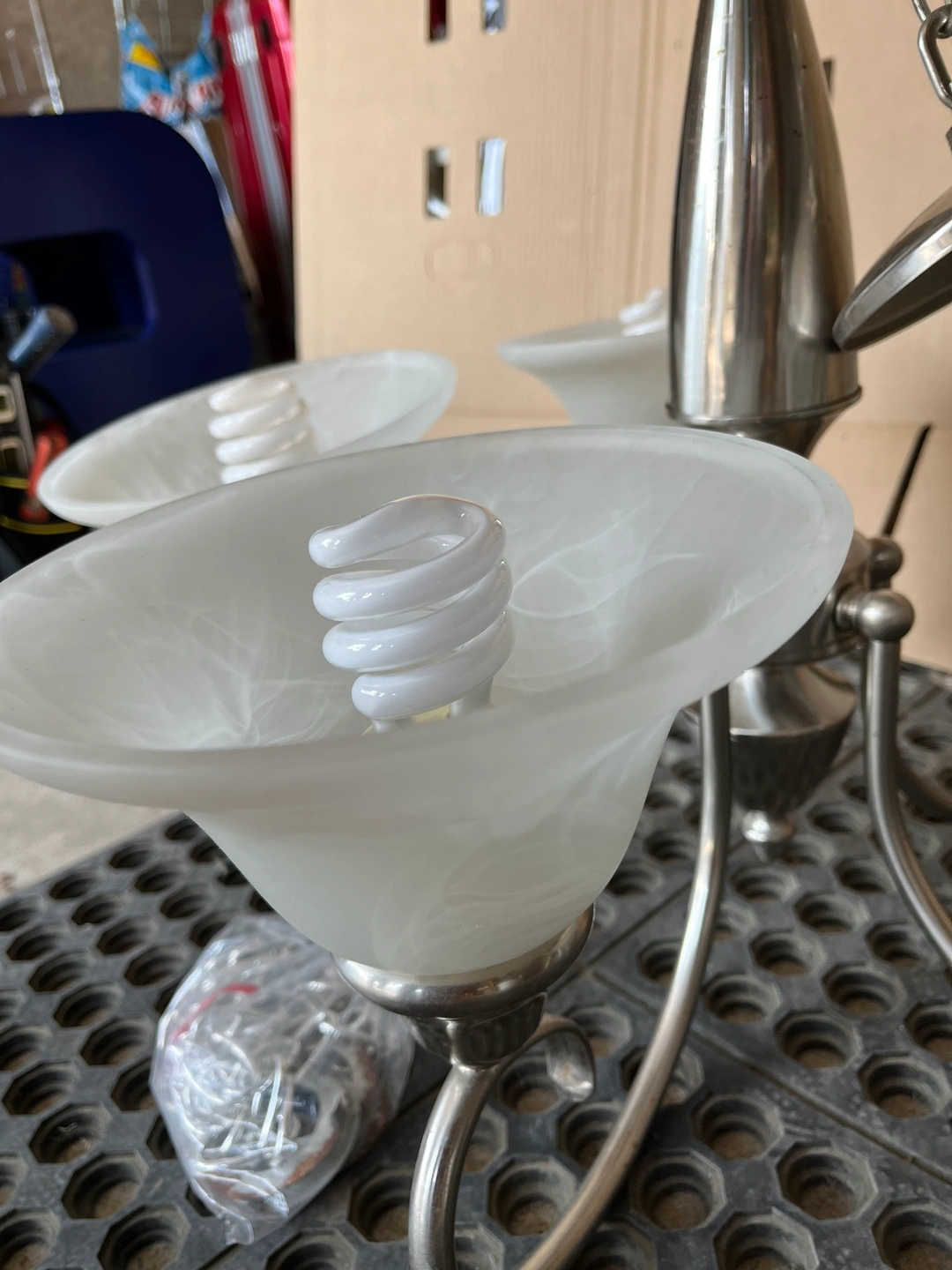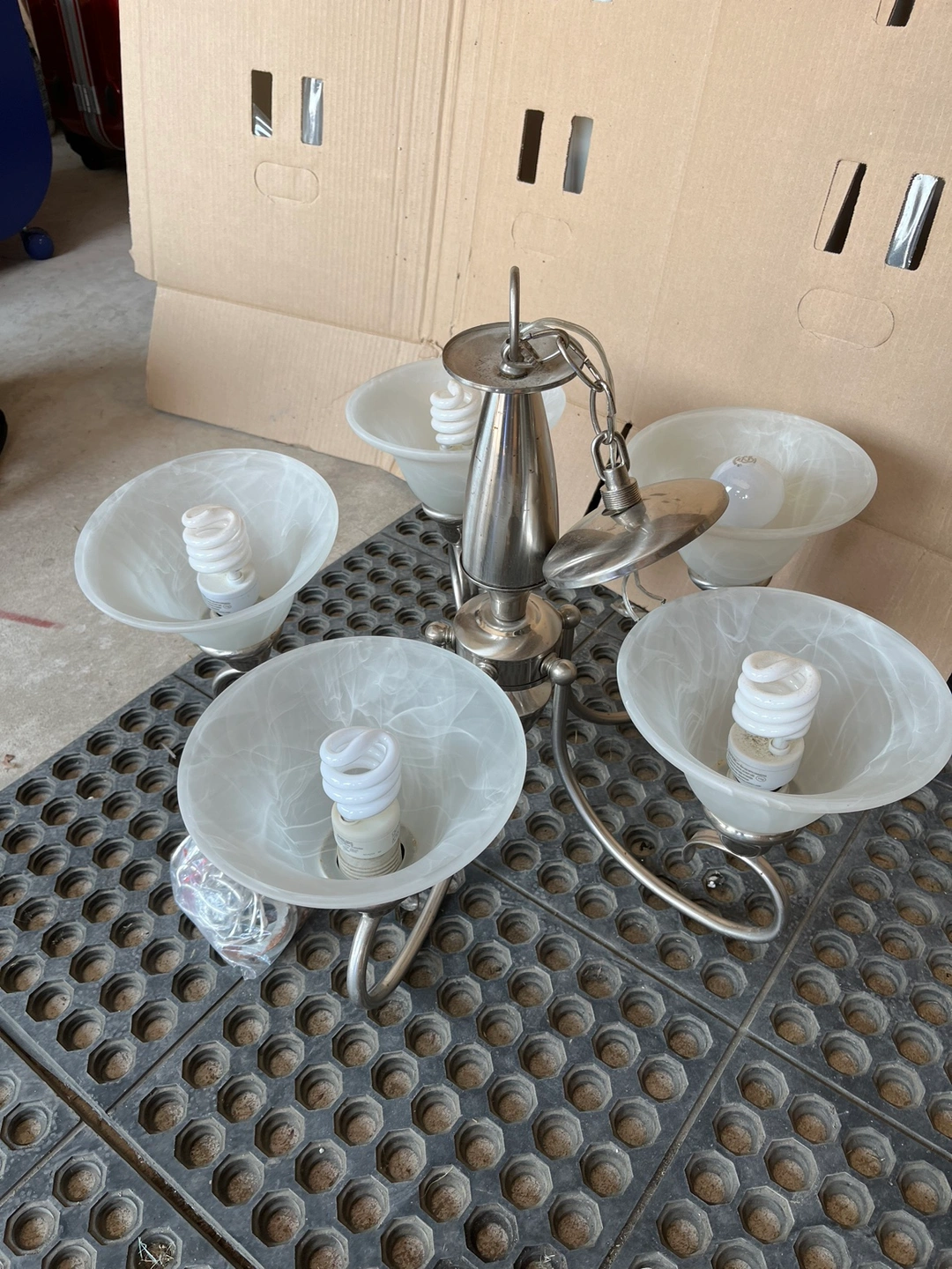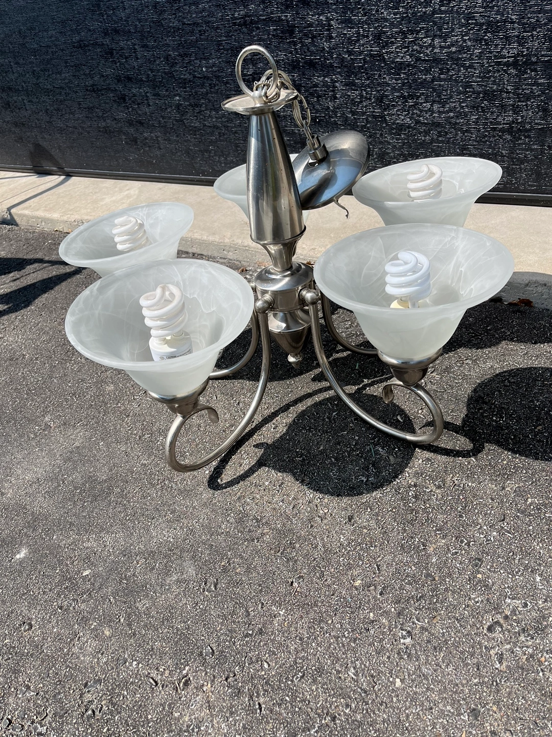 Five-light chandelier with frosted glass shades. It includes all hardware to mount the fixture. It is made of metal and in the brushed nickel finish.