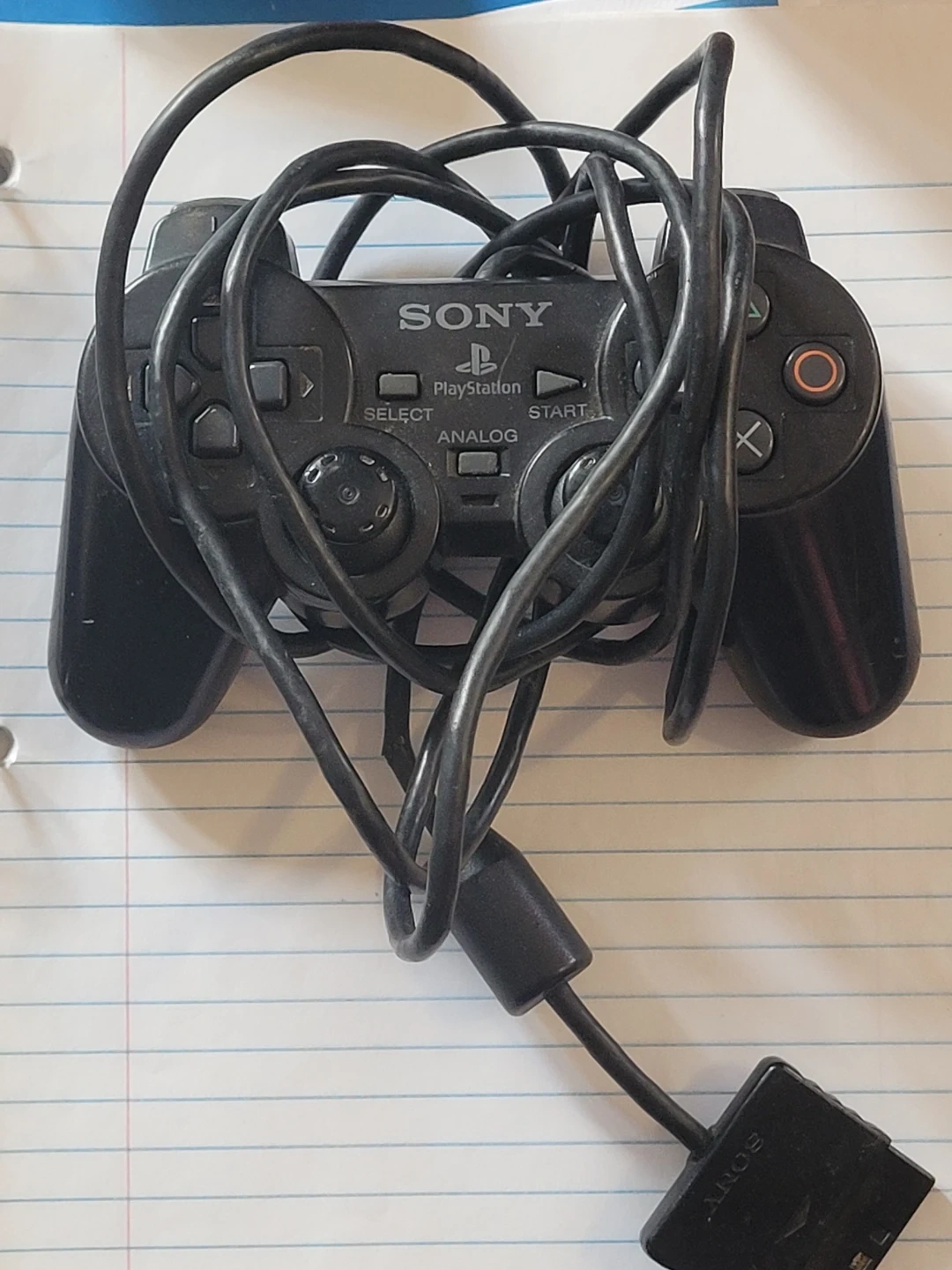 This is a black Sony DualShock 2 controller for PlayStation 2. It's a wired controller with analog sticks and vibration feedback. It has the classic PlayStation button layout.