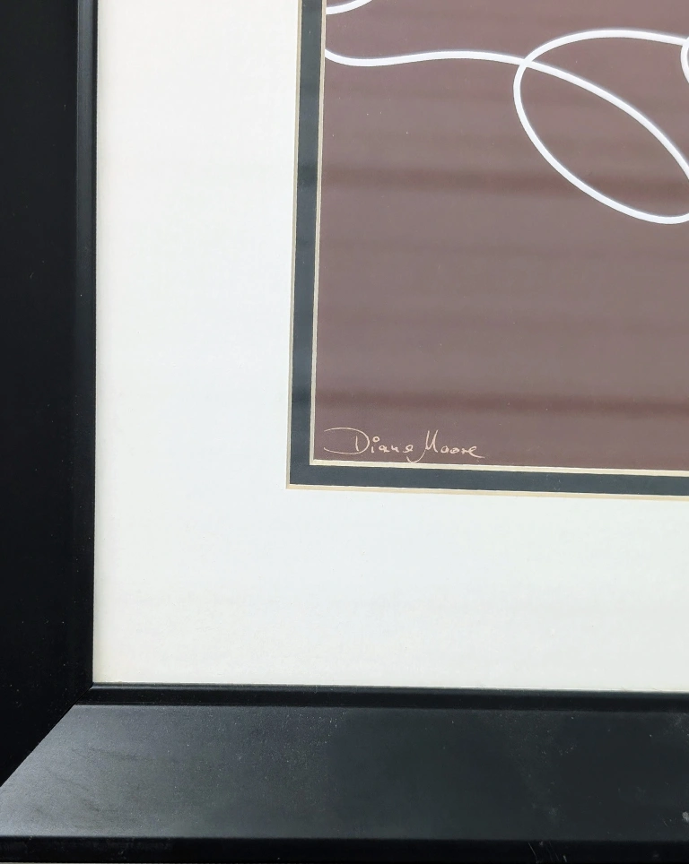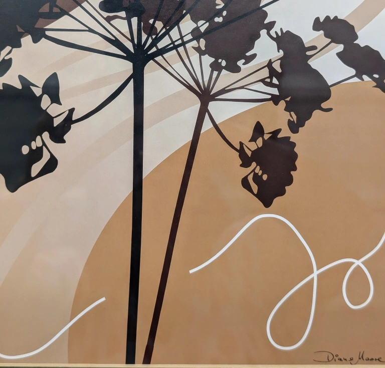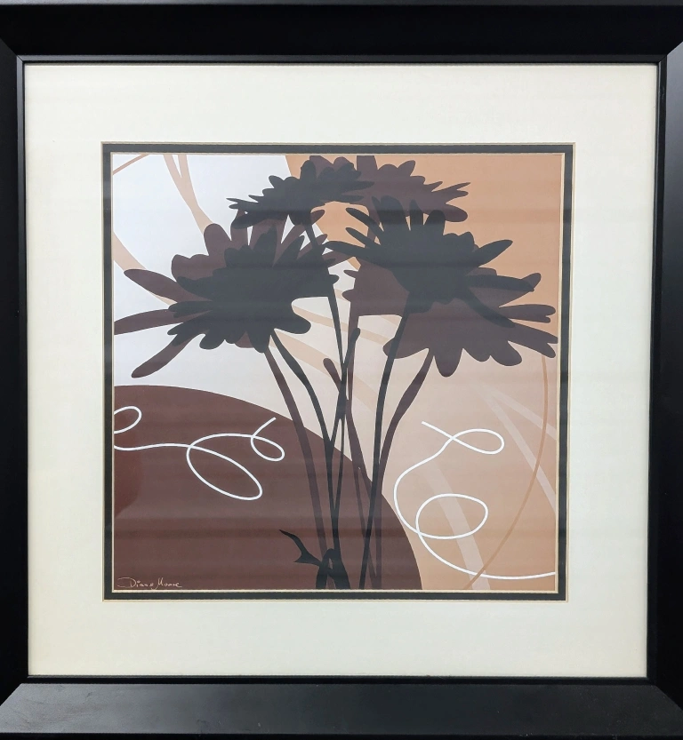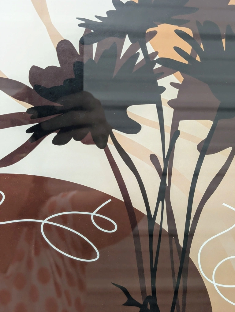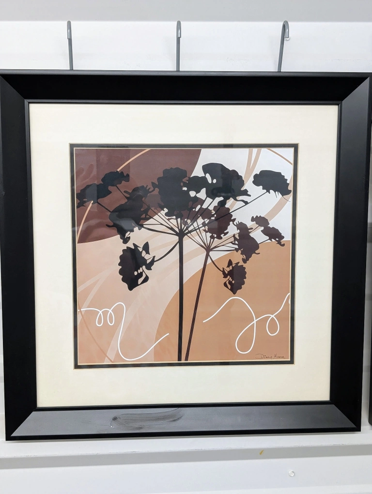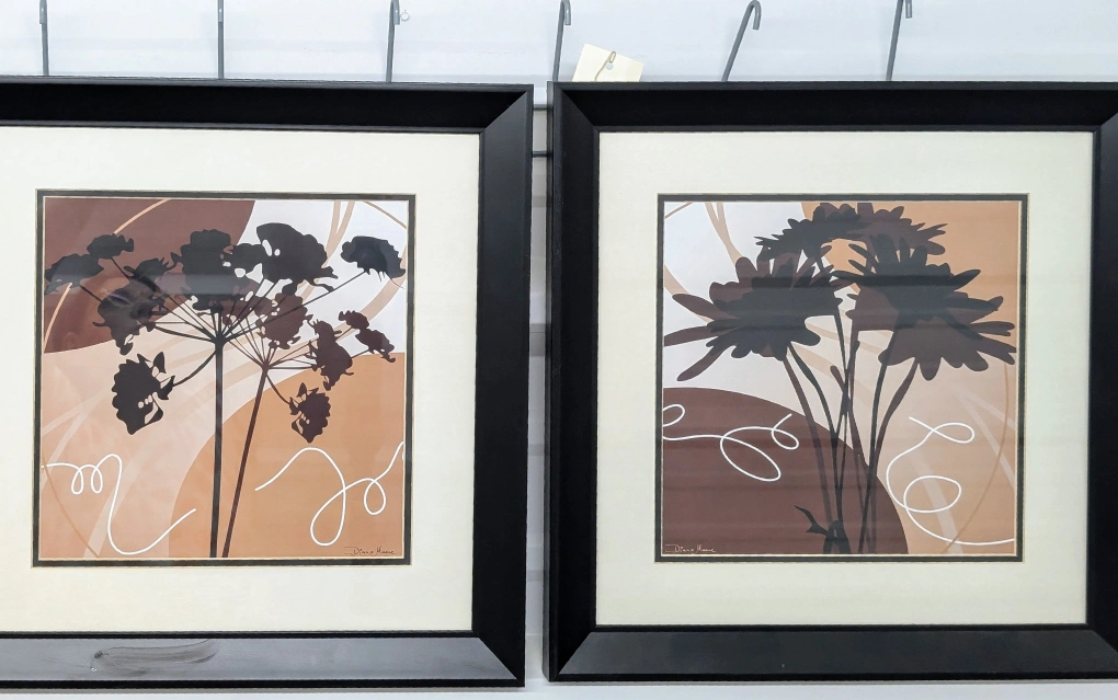 Two framed art prints in black frames. Both prints feature a brown background with black silhouettes of flowers.