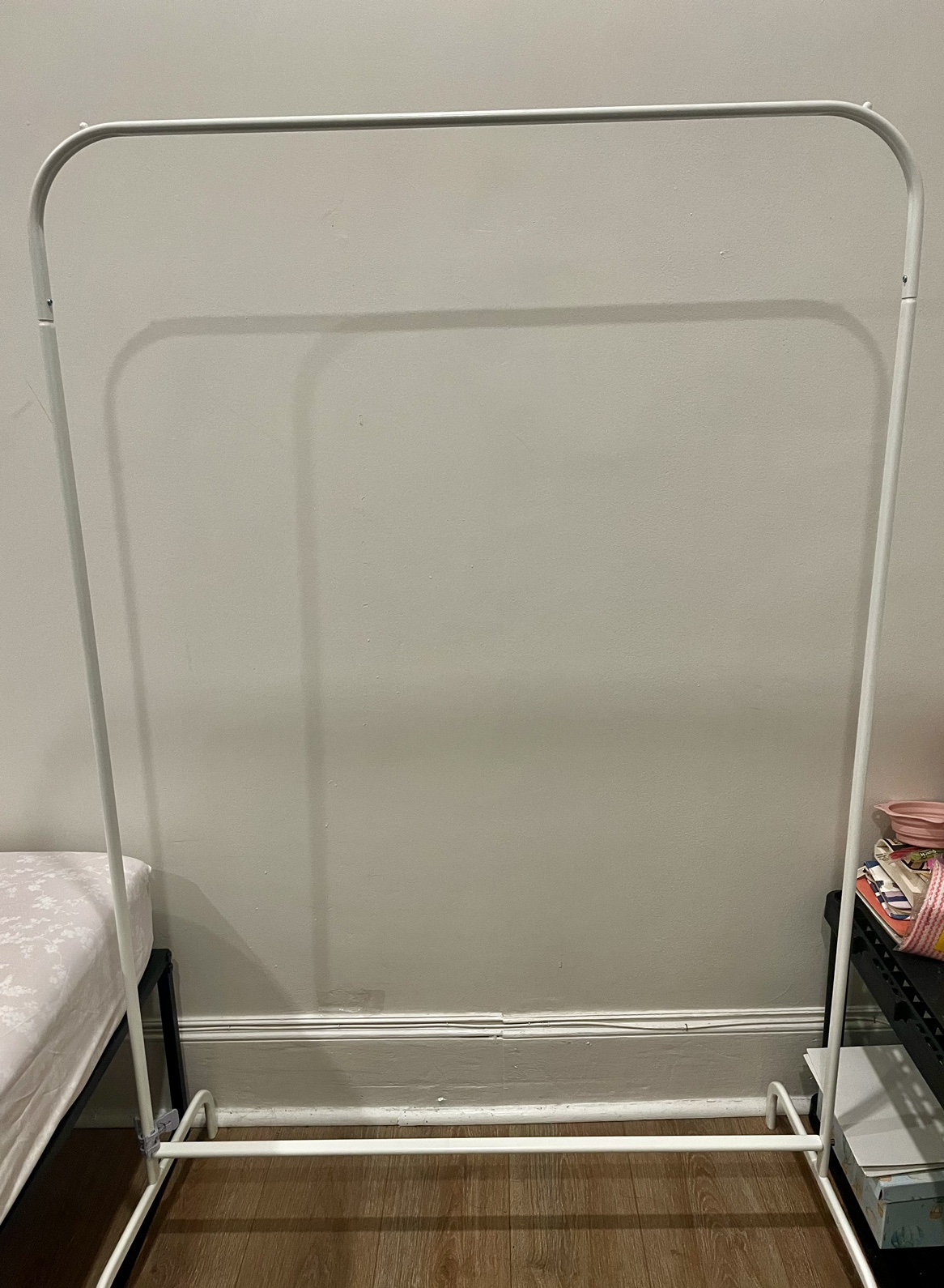 Simple white clothes rack, great for a small space. This rack is already assemble. It can be used in a bedroom, closet, or hallway.