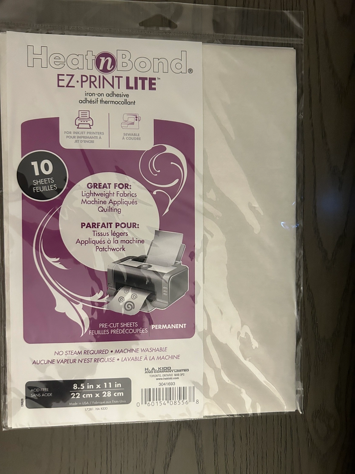10 sheets of HeatnBond EZ Print Lite iron-on adhesive. Permanent, acid-free, and machine washable. Great for lightweight fabrics, machine appliqués, and quilting. Pre-cut sheets. No steam required. Made in the USA.