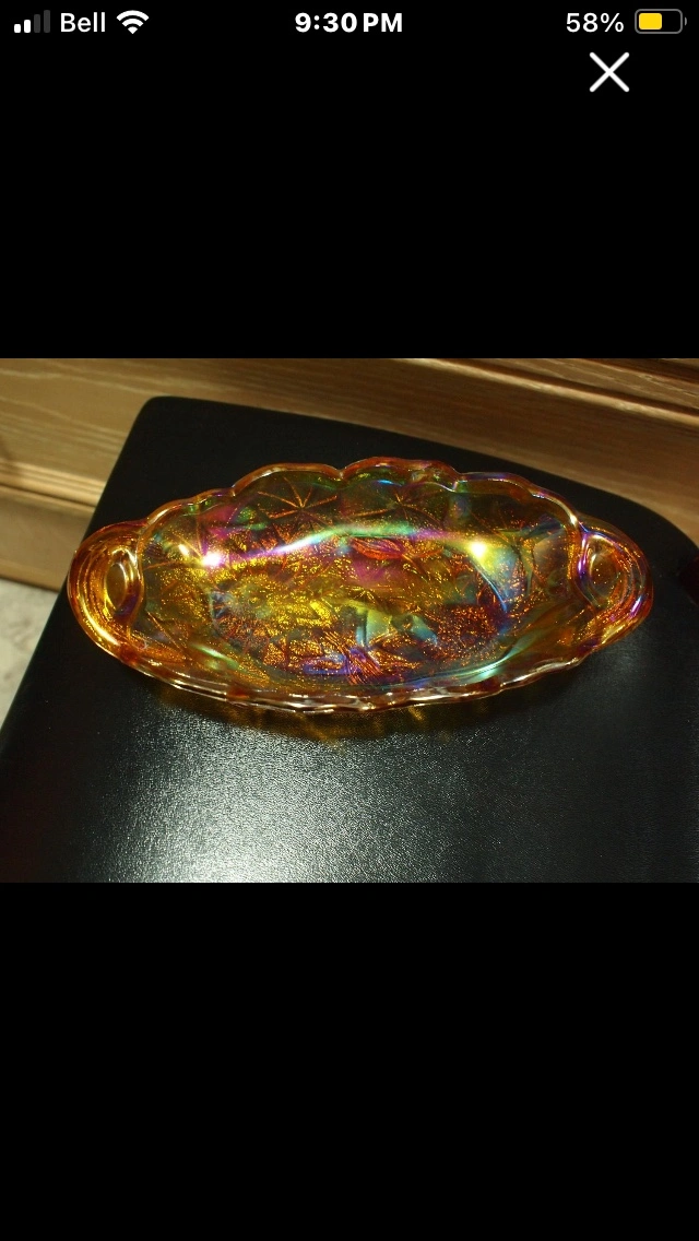 beaufil vantage dish. ( carnival glass )when light hits dish rain bow of colour 9 1/2 long 5 inches wide a 2 inches tall no chips or cracks