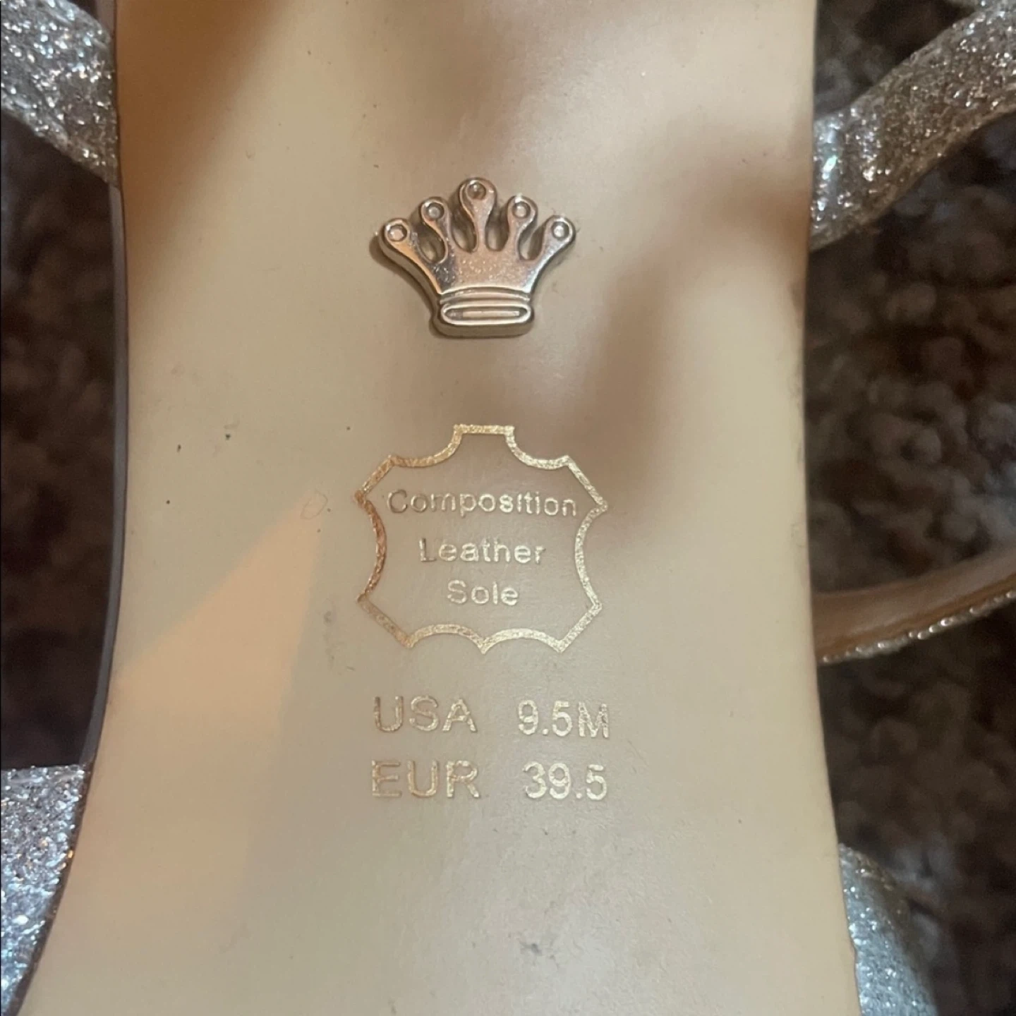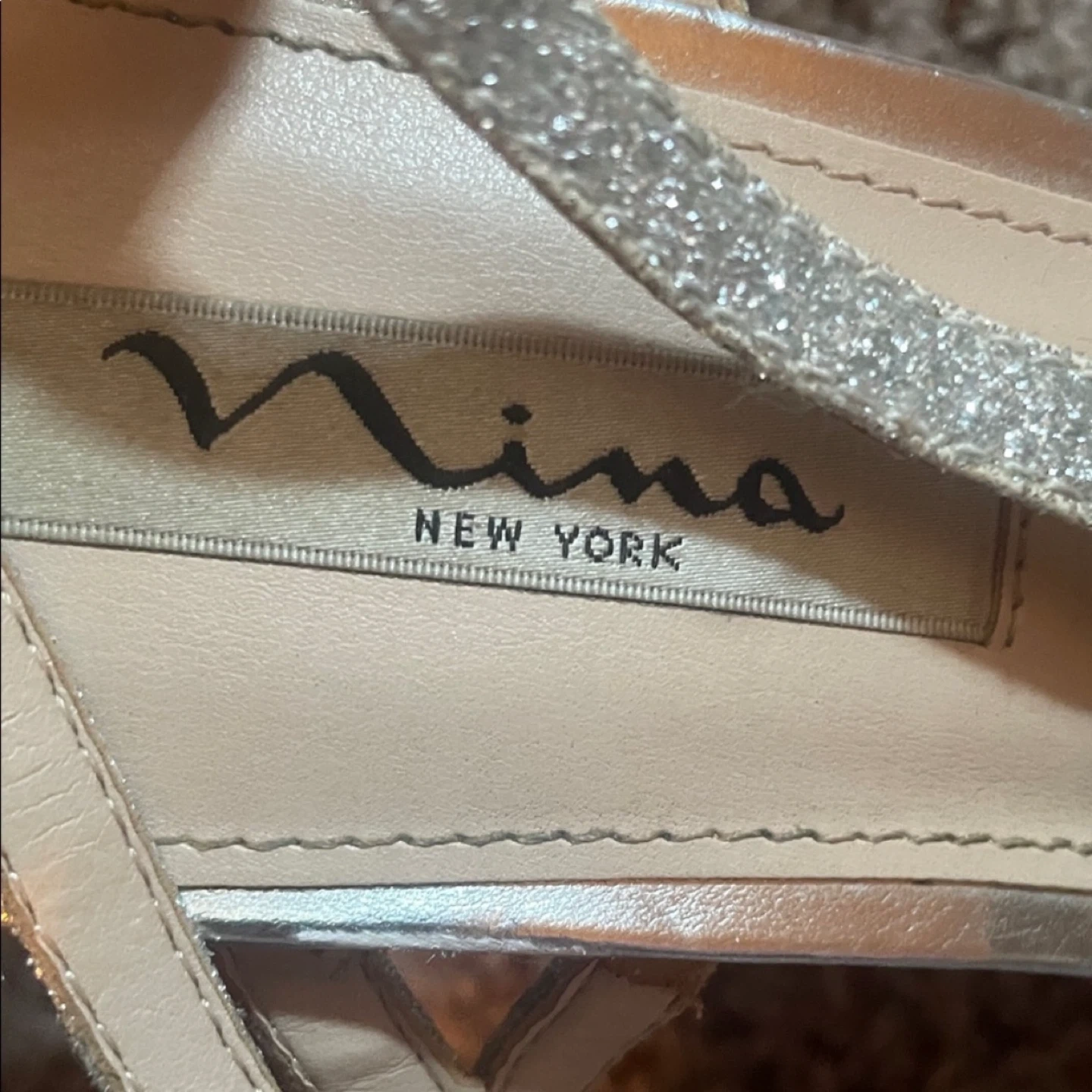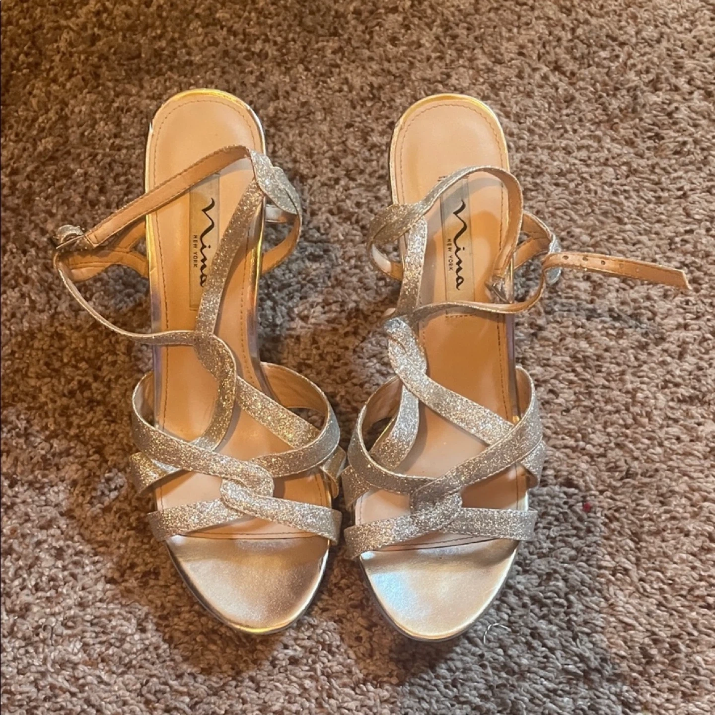 Sparkly silver glitter strappy heels by Nina. Features a classic high heel design and adjustable ankle strap. Made with a leather sole for comfort. These are a size 9 US / 39.5 EU. Perfect for dressing up any outfit for a night out or special occasion!