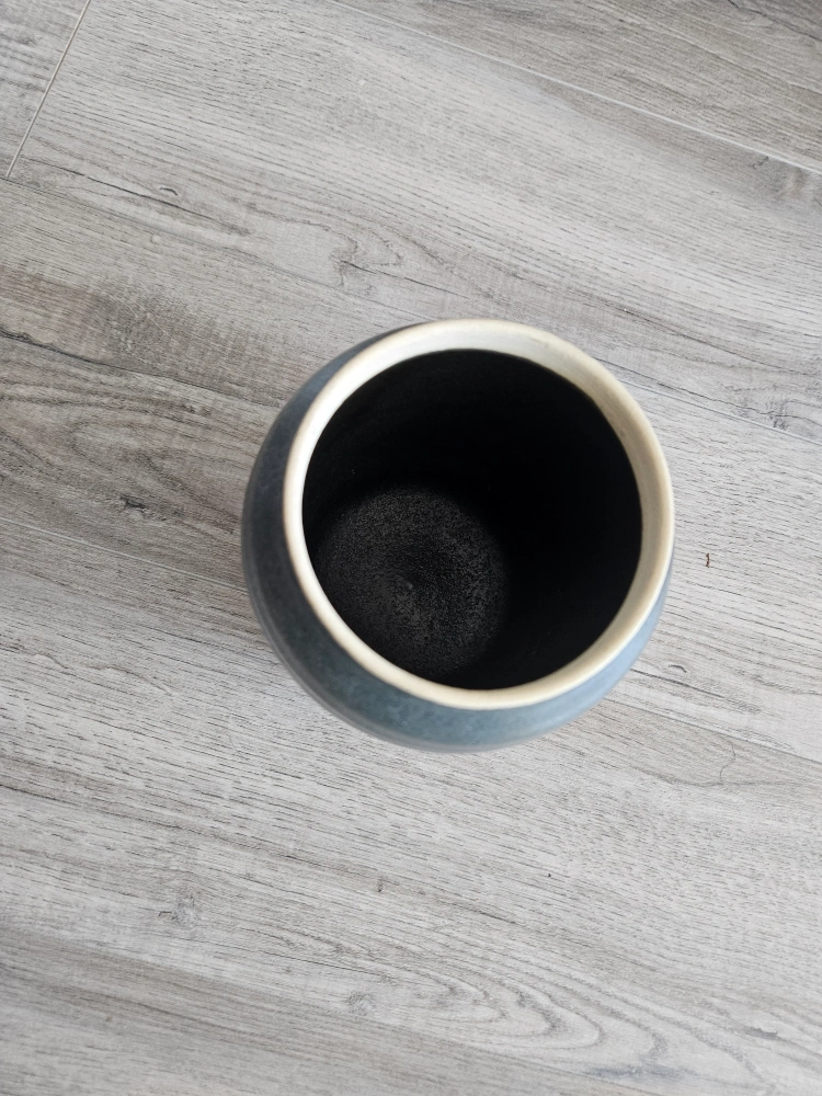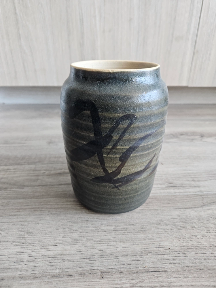 Black and white ceramic vase with a design on the front. The vase has a glazed finish. It is 7 inches tall and 4 inches wide.