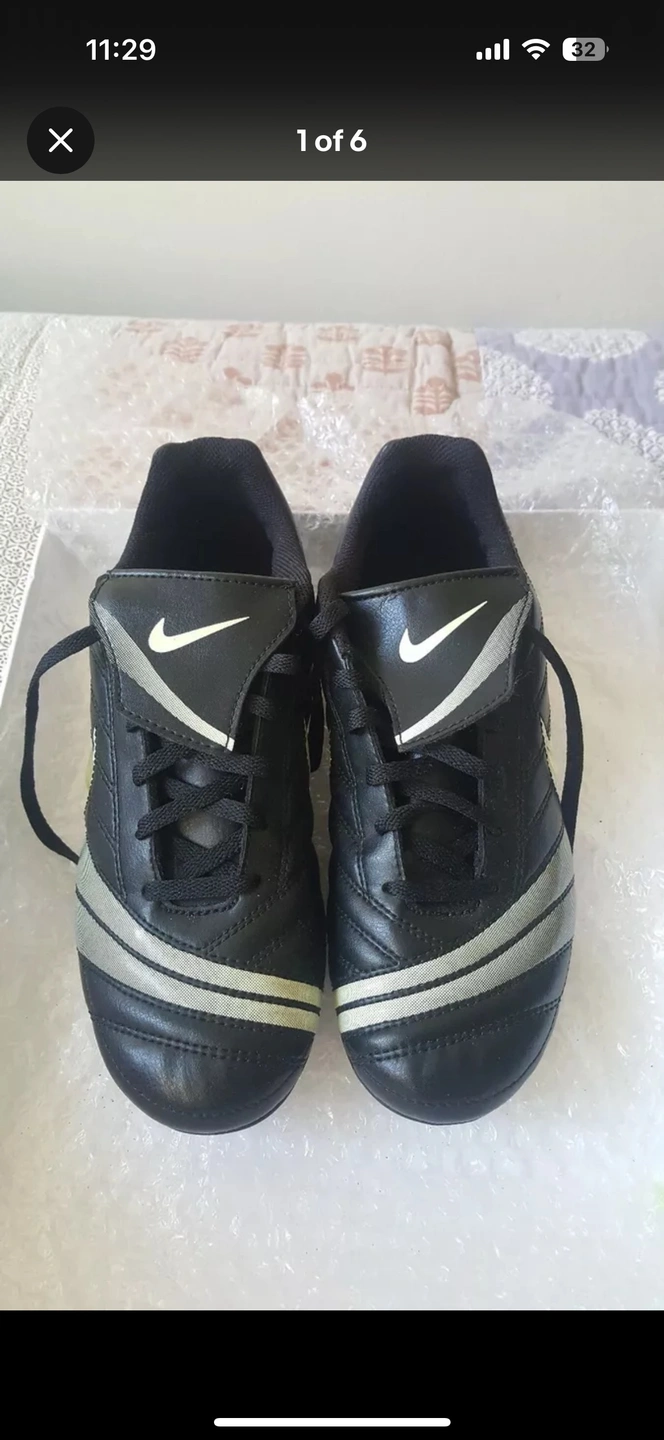 You are considering this pair of black, white and silver black athletic soccer shoes with cleats in size 5.5Y for boys or girls. Worn only once.
